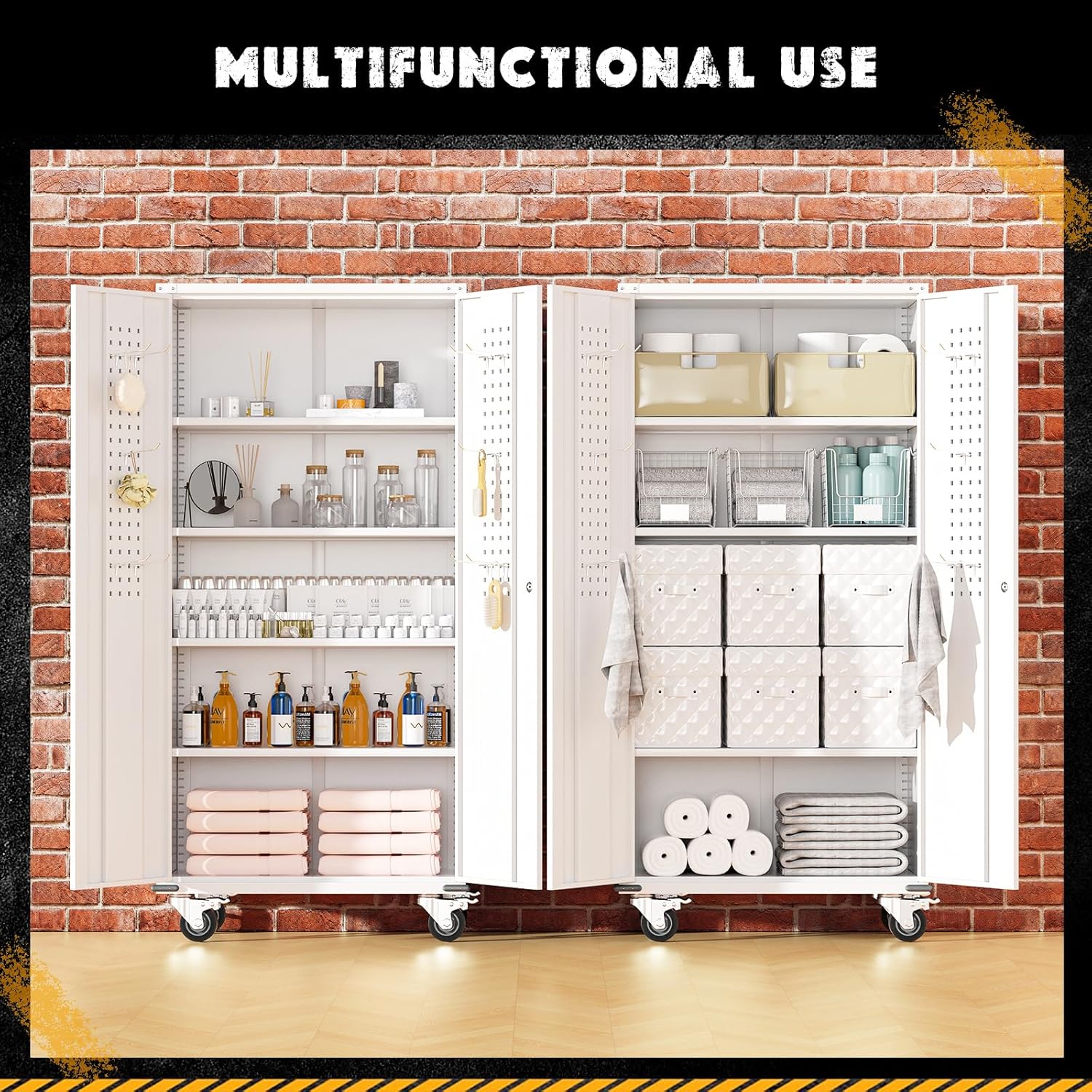 Greenvelly 72" Metal Storage Cabinet with Wheel and Pegboard, Lockable White Metal Garage Cabinets with 2 Doors and 4 Adjustable Shelves, Rolling Steel Tool Cabinet for Garage, Home Office, School