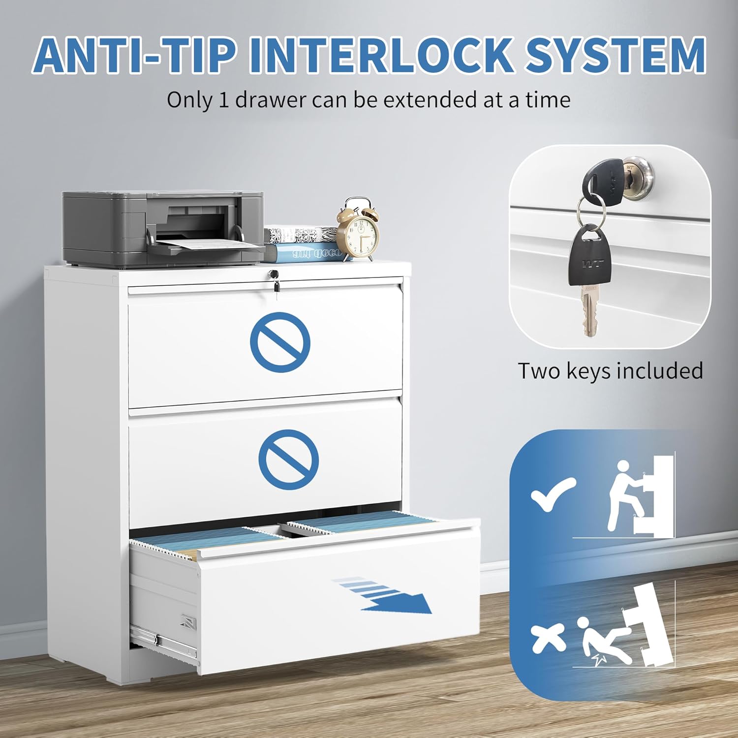 - ăEnhanced Safety Featuresă To prevent tipping hazards, FLIXELIO 3 drawer file cabinet with lock includes a built-in anti-tip mechanism that allows only one drawer to open at a time. This thoughtful design minimizes safety risks and ensures stability, even when multiple drawers are in use.