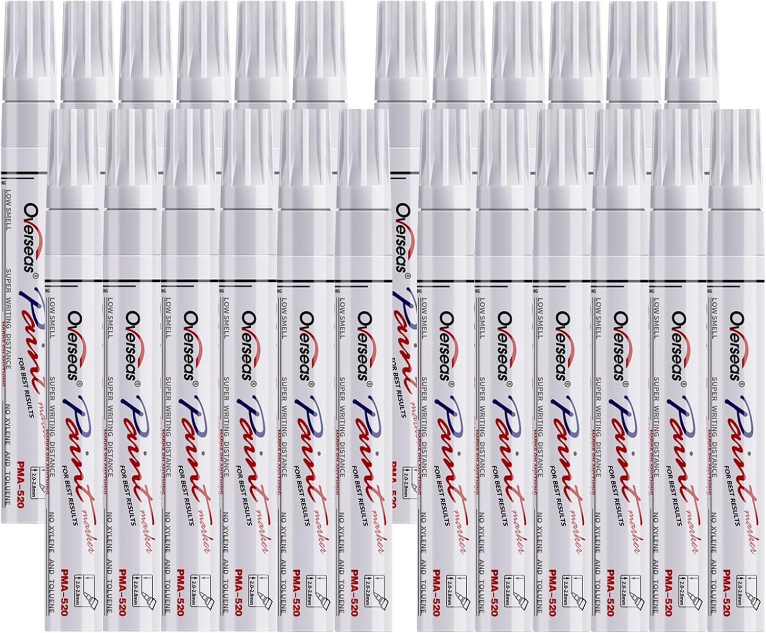 Overseas White Paint Pens Permanent Markers 24 Pcs, Oil Based Paint Markers Set, Quick Drying, Waterproof, Medium Tip Marker Pens for Metal, Rock, Wood, Plastic, Canvas, Glass, Stone, Rubber, Paper