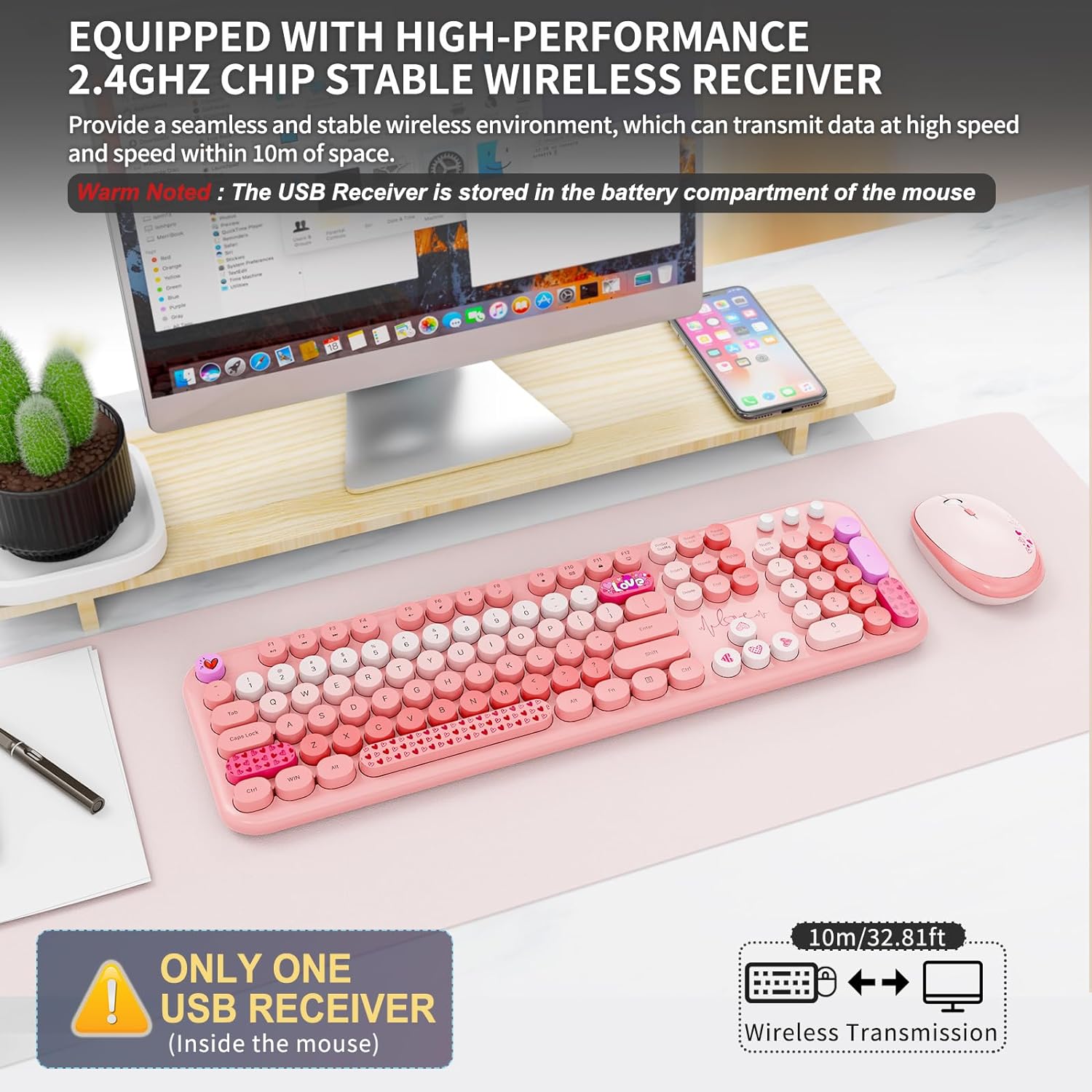 - ⊙ Fashion & Quiet Mouse Design Desk Accessories Keyboard - Stylish retro keyboard and mouse wireless with colorful round 104keys and glossy smooth edges to brighten your workspace. Featuring low-profile whisper-quet technology, this sleek combo ensures a distraction-free typing experience. Perfect for modern desks seeking cute wireless keyboard and mouse aesthetics.