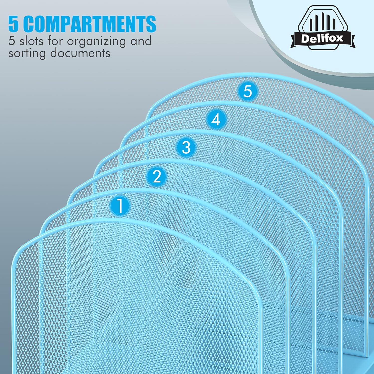 - ▶ SUFFICIENT SPACE FOR STORAGE. Delifox 5-compartment desktop file organizer is large enough to hold and classify many document or papers so as to eliminate worry of document run-off and keep track of files, folders, and other important papers