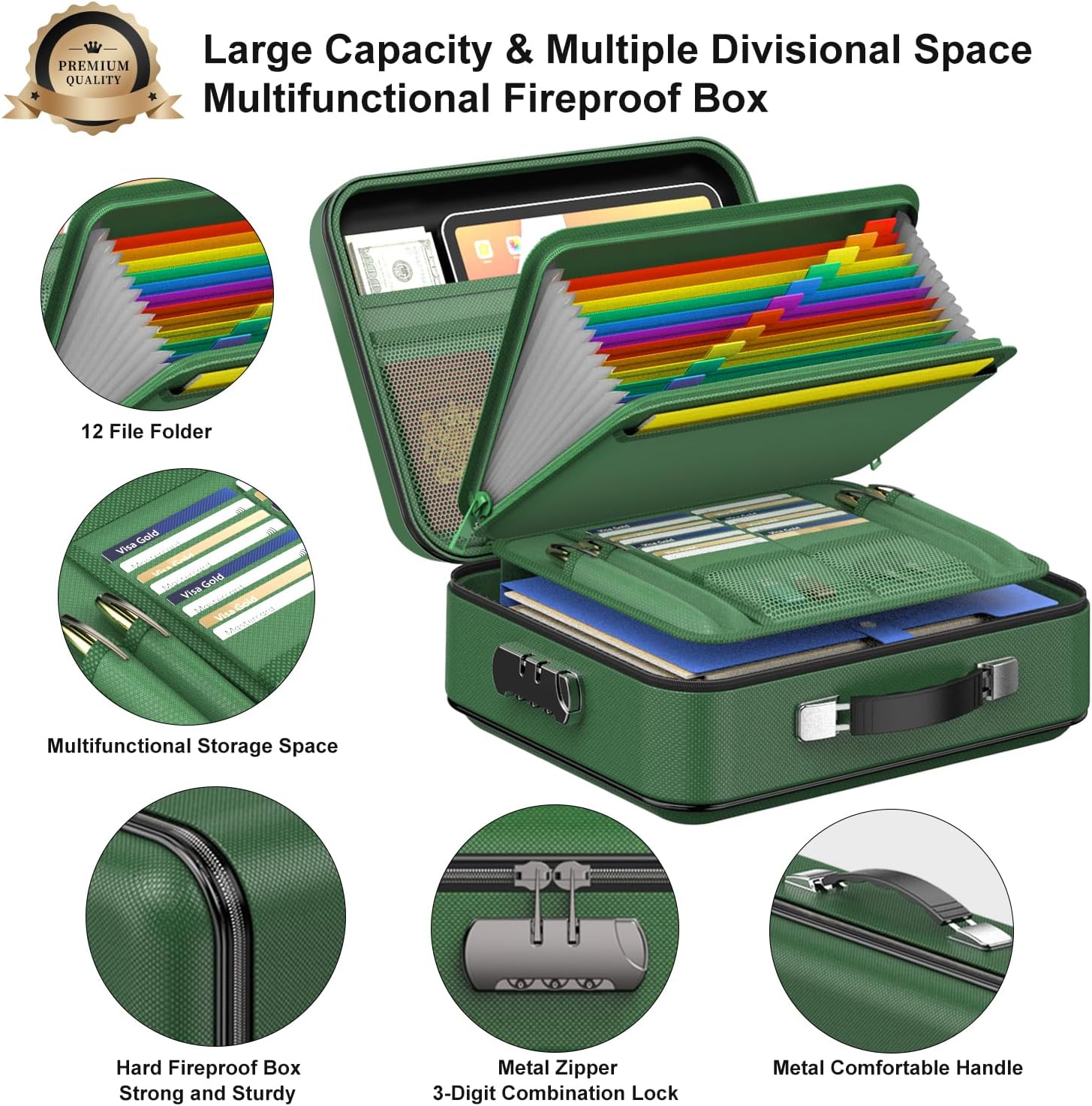 Fireproof Document Folder, Hard Fireproof Waterproof Document Box with Lock Creative Hard-Shell Design Fireproof Document Box for Important Documents Certificates Laptop Passports Green