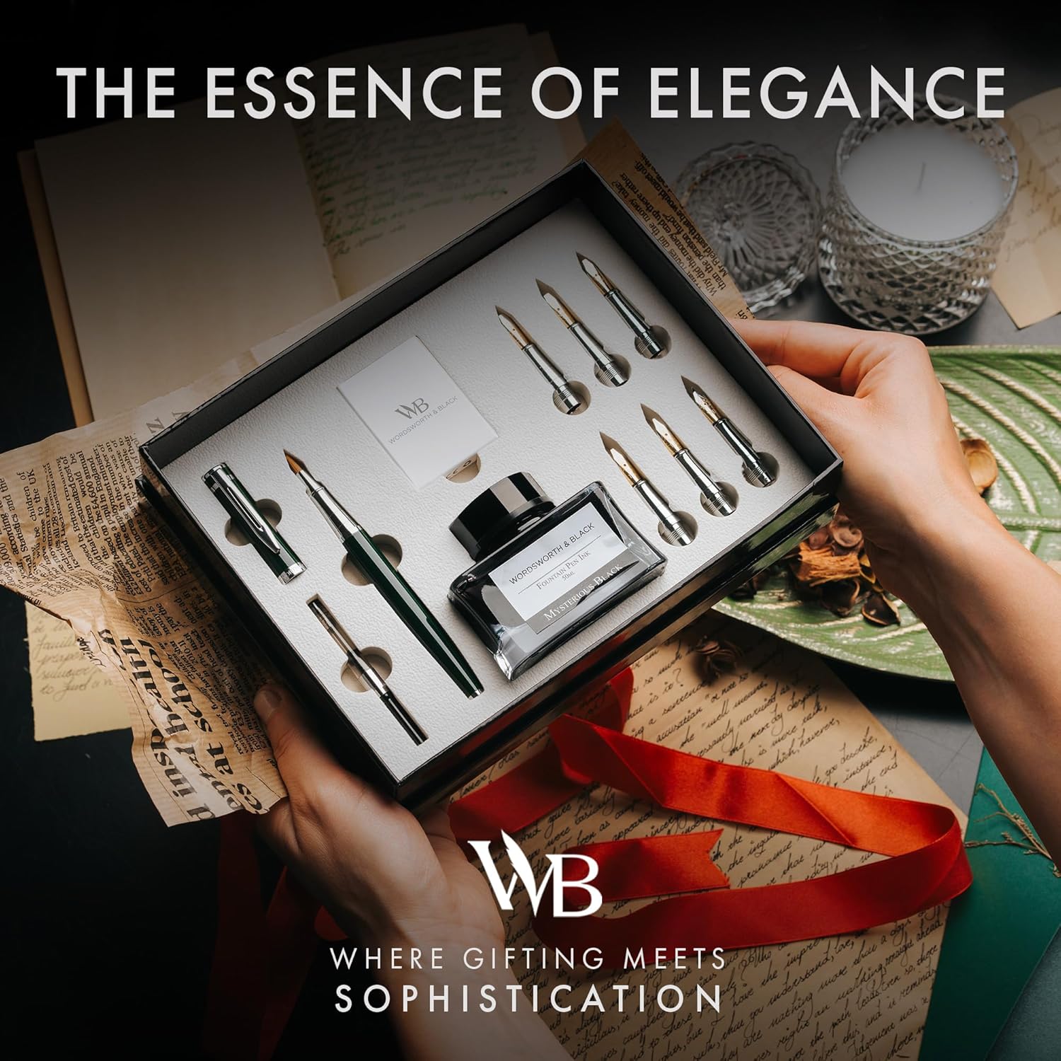 Wordsworth & Black Calligraphy Pen Gift Set, Includes Bottle, 6 Cartridges, Refill Converter, 6 Replacement Nibs, Premium Package, Journaling, Smooth Writing Pens [Green Chrome]