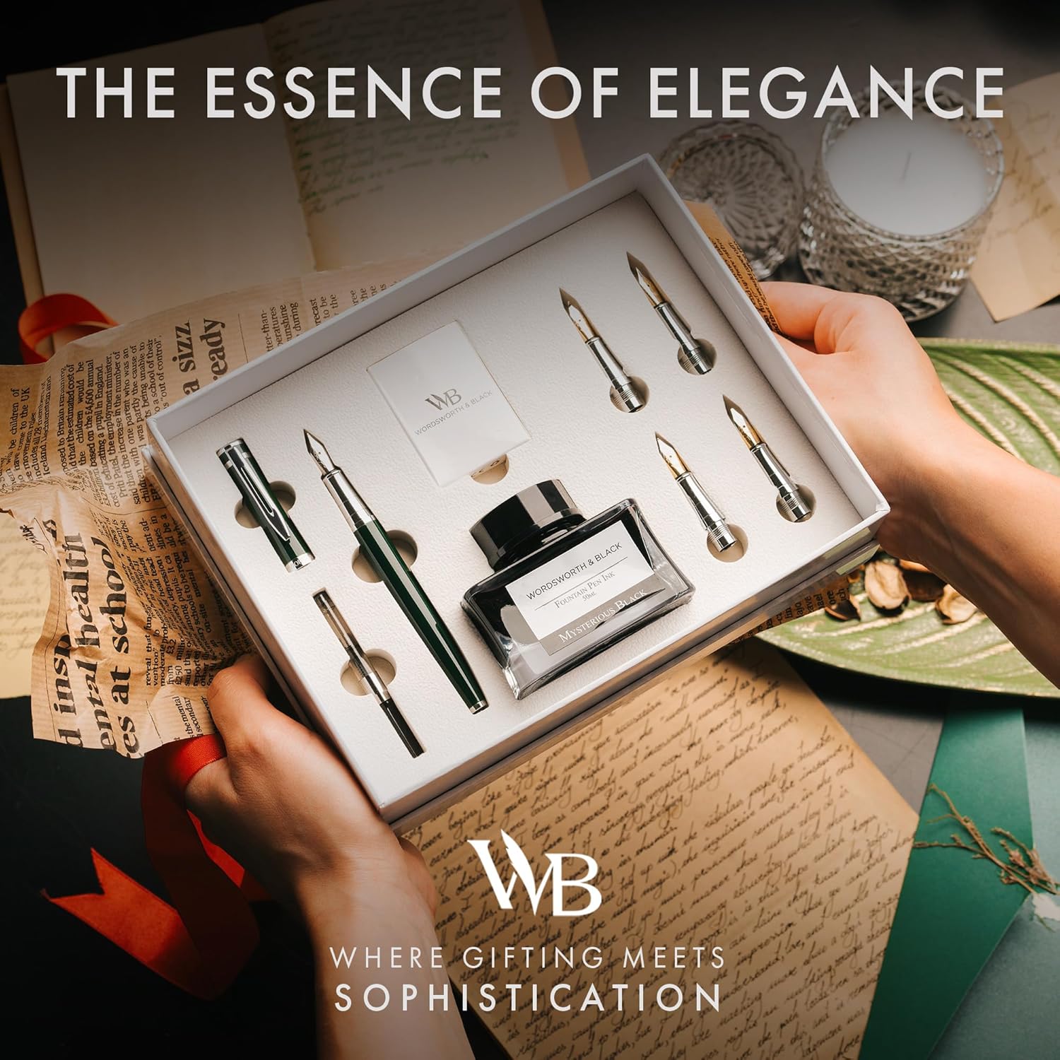 Wordsworth & Black Fountain Pen Gift Set, Includes Bottle, 6 Cartridges, Refill Converter, 4 Replacement Nibs, Premium Package, Journaling, Calligraphy, Smooth Writing Pens [Green Chrome]