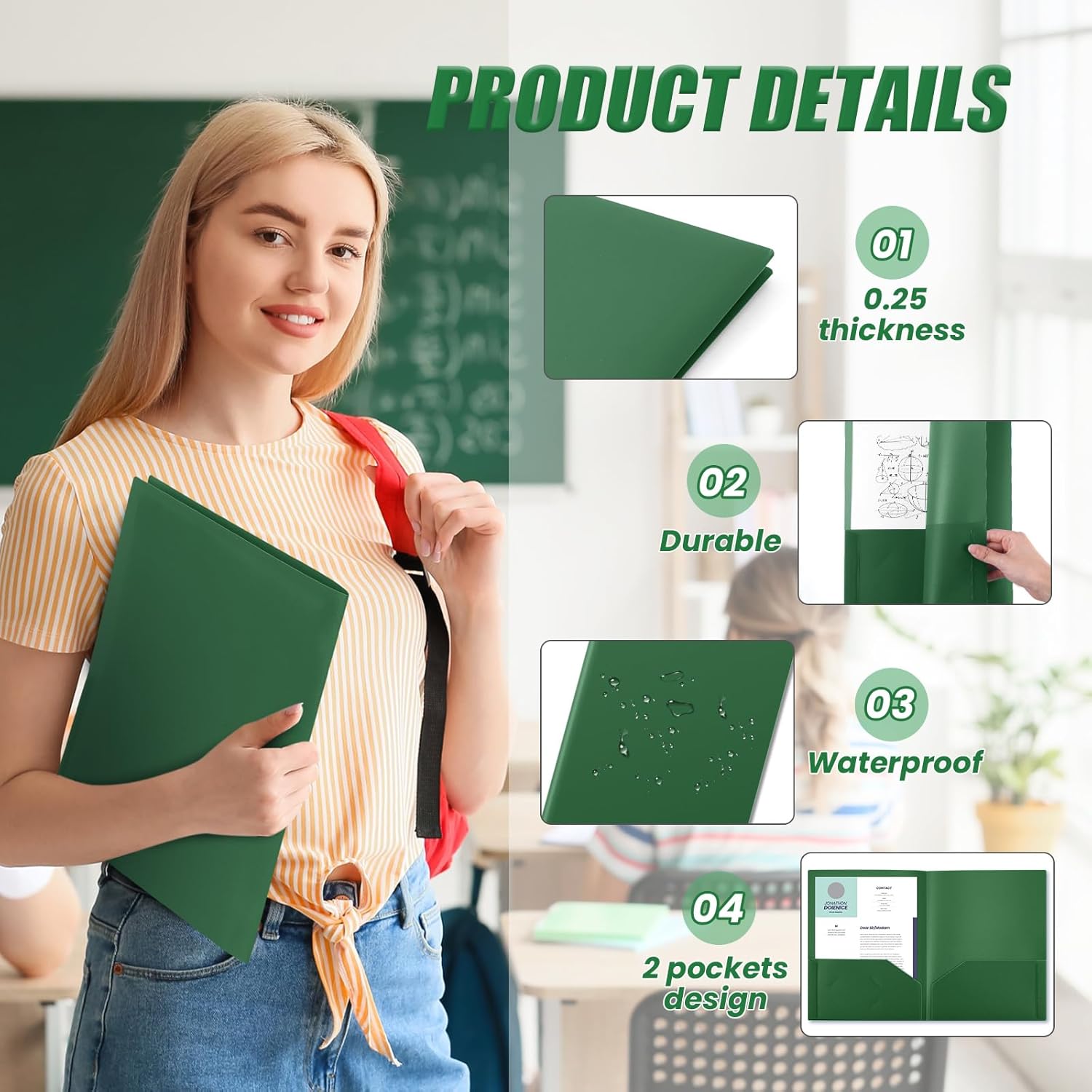Gueevin 50 Pcs Plastic Folders with Pockets, Back to School Two Pocket Folder Fit Letter Size, Heavy Duty School Business Card Holder for Home Office, 11. 61 x 9. 45 Inches (Dark Green)