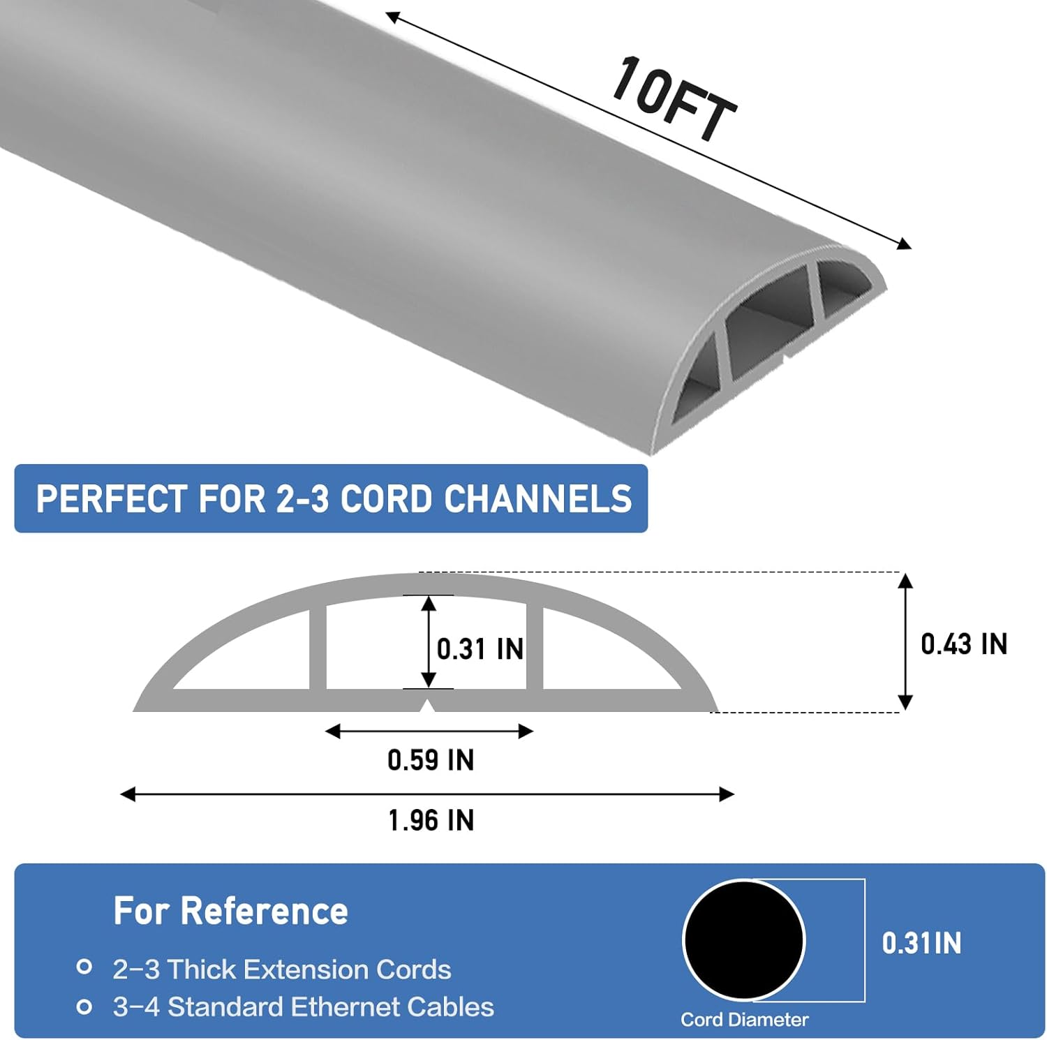Floor Cord Cover Self Adhesive Cord Hider Floor Extension Cord Covers for Floor Power Cord Protector Cable Management Prevent Cable Trips Cable Cavity 0.59" W x 0.31" H (Grey, 10Ft)
