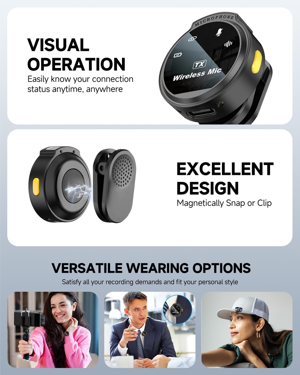 - Omnidirectional Mic with Noise Reduction: Supports one-click on the yellow button to turn on/off the noise cancellation on TX and RX. The built-in intelligent active noise Cancellation chip and advanced 2.4GHz transmission technology, which allows you to record clearly in noisy environments, which can provides more vivid, soft, natural and stereo sound around for recording or real time video.