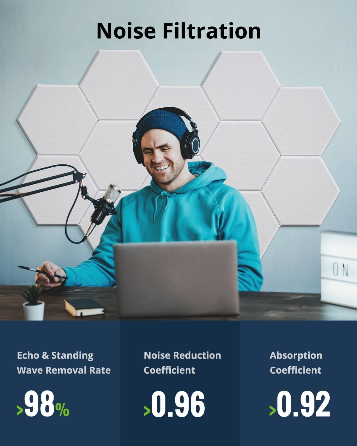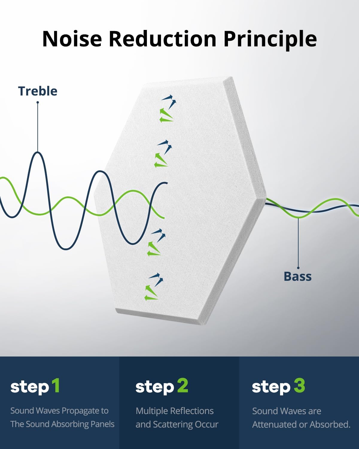 - HEXAGONAL STYLISH DESIGN: Add a touch of modern elegance to any room with our hexagon soundproof wall panels. These sleek and stylish sound proof foam panels for walls not only improve sound quality but also serve as eye-catching decorative elements, elevating the aesthetic appeal of your space.