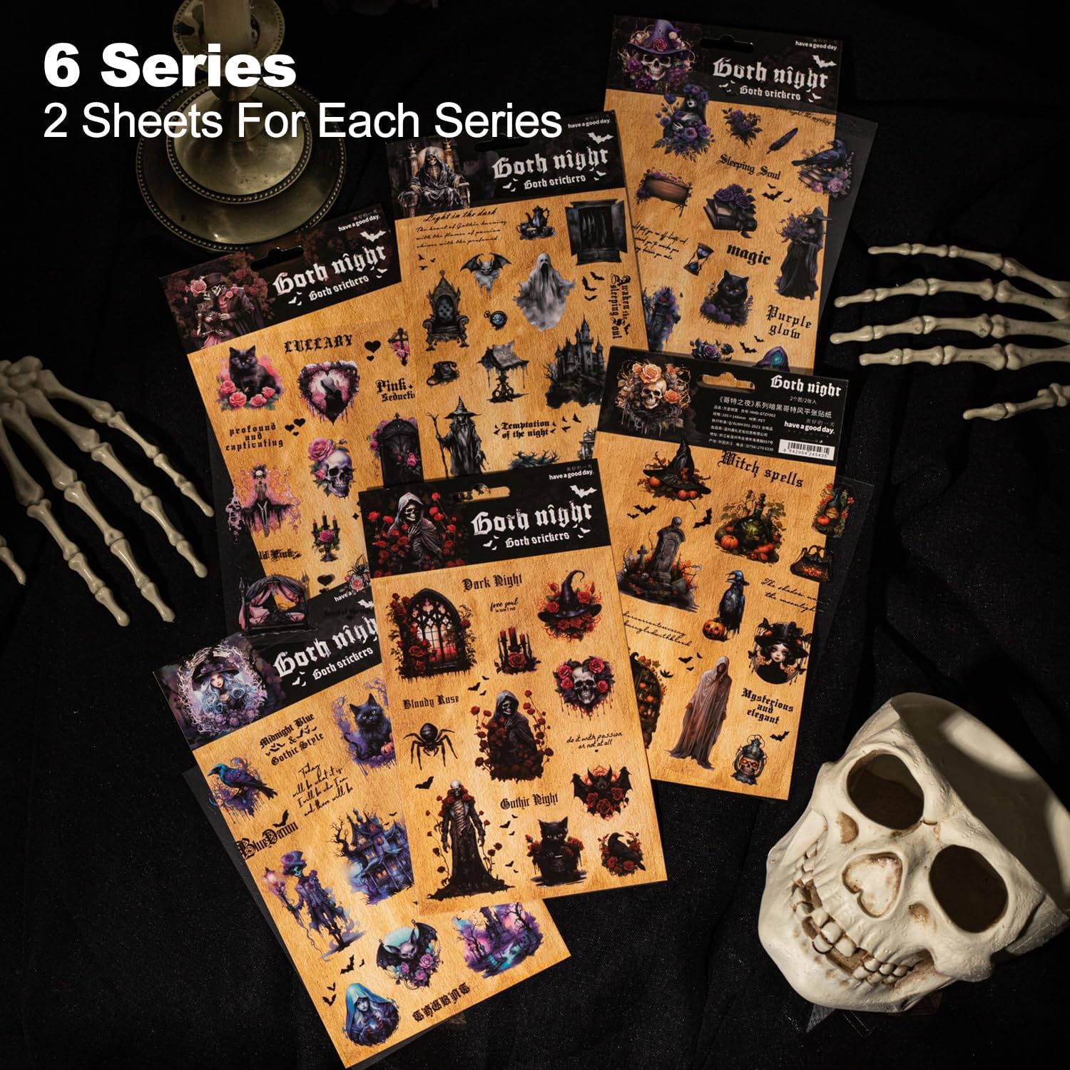 - Unique Gothic Designs: This Goth Night sticker set features 12Pcs distinctive designs inspired by gothic themes, including cats, skulls, skeletons, witches, and roses. Perfect for adding a touch of dark elegance to your scrapbooks, journals, and DIY projects.
