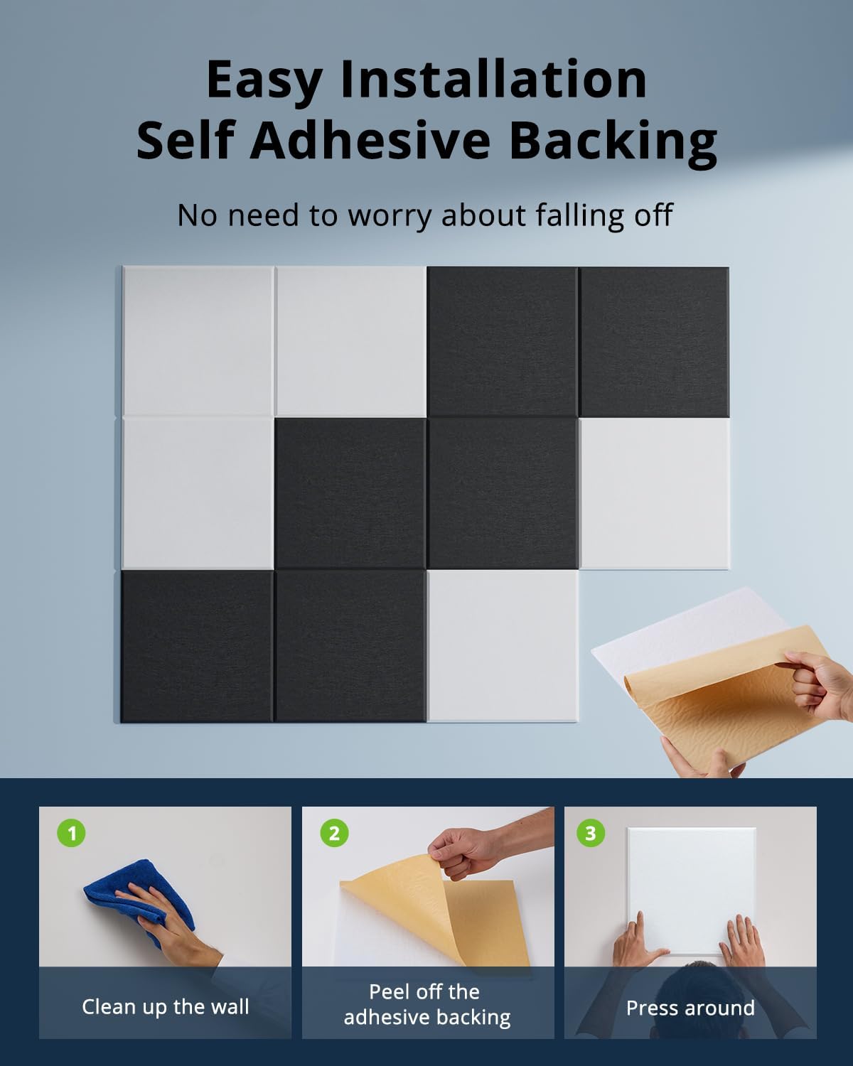12 Pack Acoustic Panels Square Soundproof Wall Panels 12"X12"X0.4" Self-adhesive Sound Proof Panels for Walls High Density Acoustic Foam Panels for Home, Door, Office, Reccording Studio Black