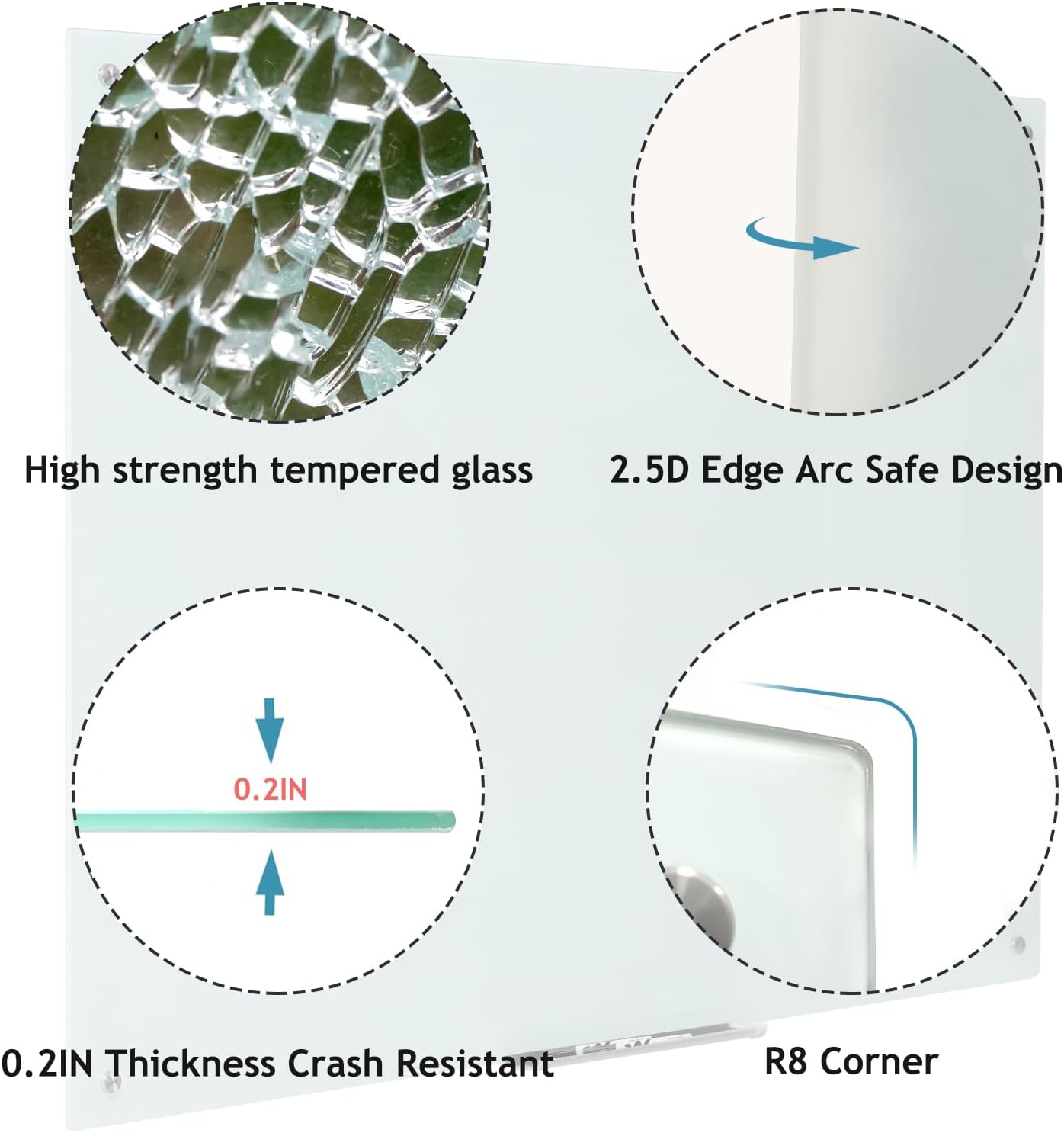 - Frameless Tempered Glass Design: Our glass whiteboard features a sleek frameless design that maximizes the writing area, allowing for unrestricted creativity. With a size of 36 * 72 inches, the smooth tempered glass surface ensures effortless writing, easy wiping, and no dust accumulation.
