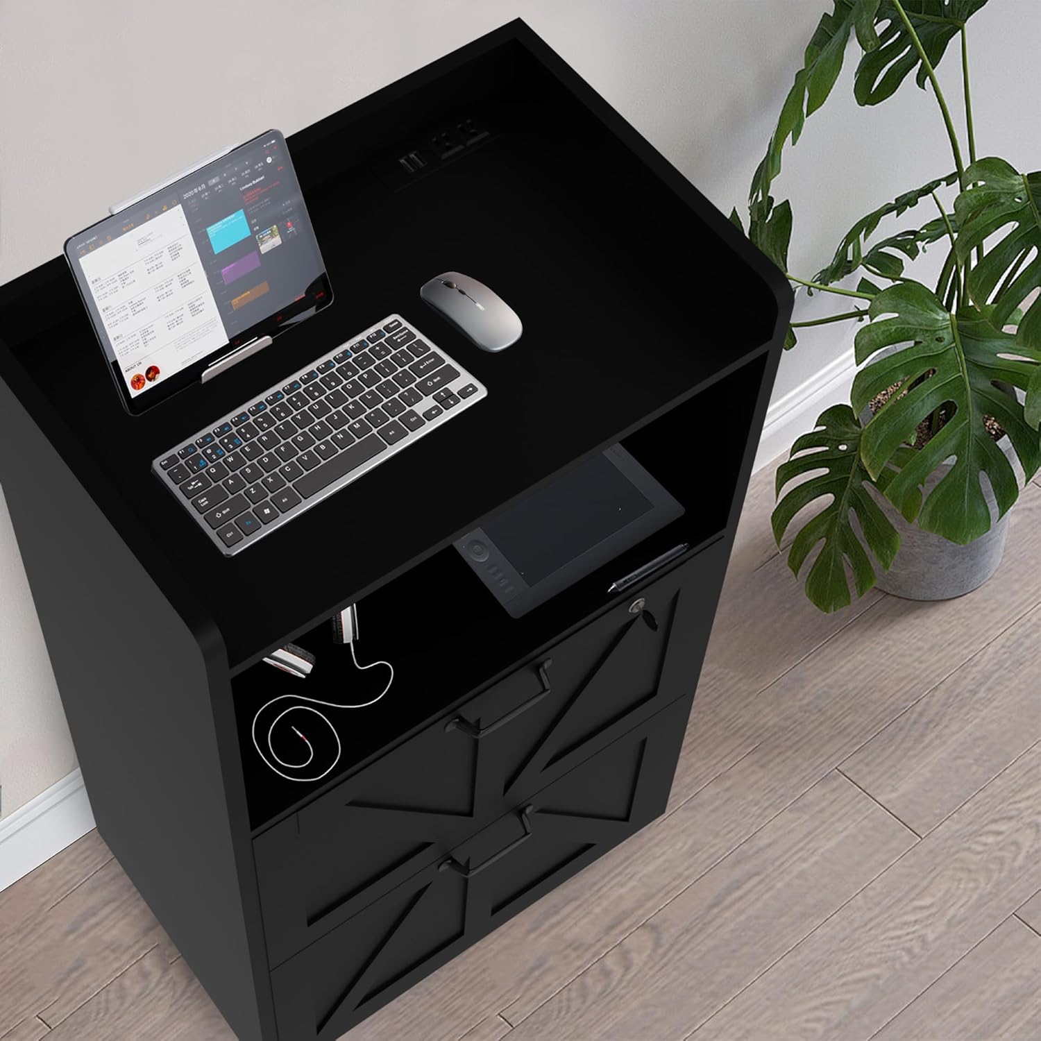 - ăFile Cabinets with Charging StationăWith 2 built-in power outlets and 2 USB charging ports, this lateral file cabinet provides flexible and fast charging for your printers, scanners, cell phones, tablets, and other office power devices.