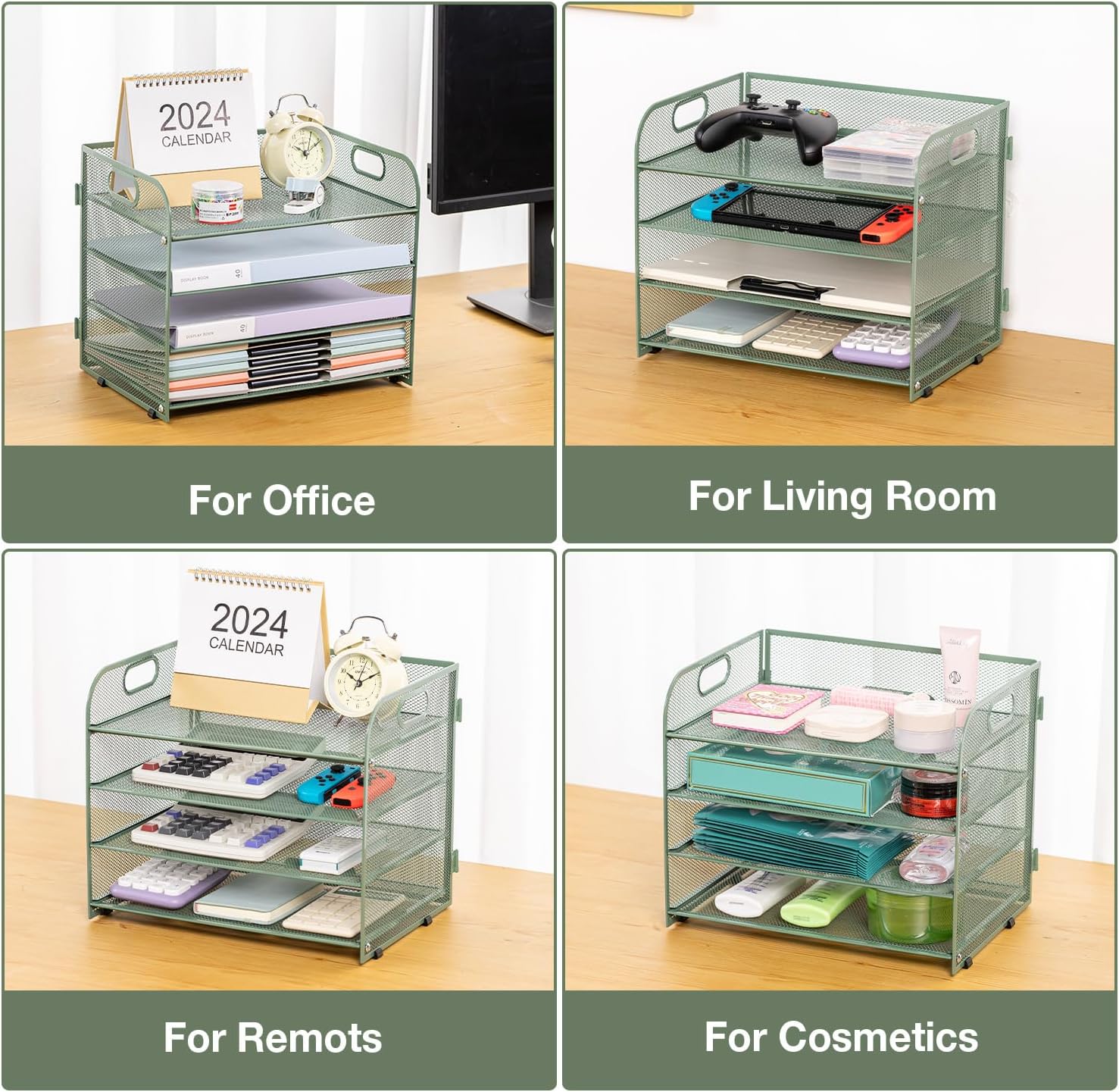 Green Mesh Letter Tray Paper Organizer with Handle - 4-Tier Desk Organizer for Office Supplies