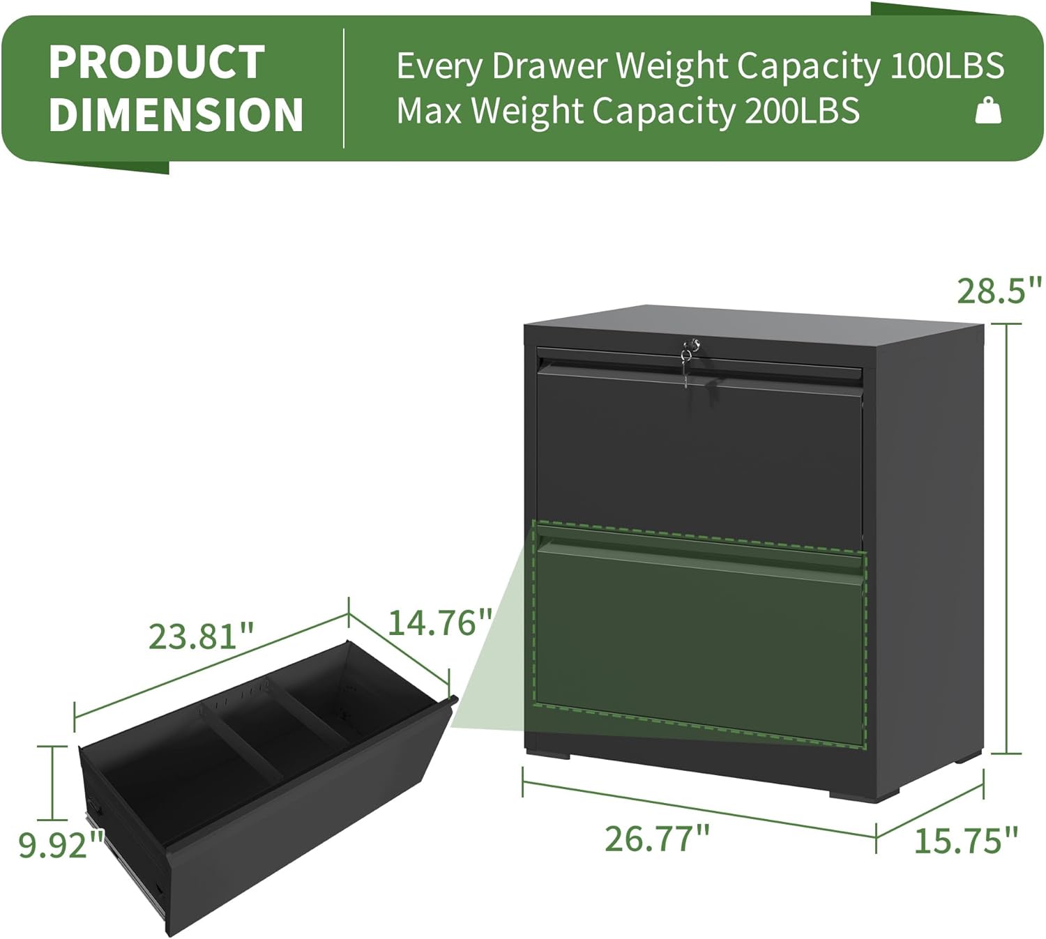 - 【Flexible File Storage Space】The overall size of EKJ 5 drawer lateral file cabinet is 28.5"H x 26.77"W x 15.75"D, each drawer size is D14.76"*W23.81"*H9.92". Each drawer can bear a maximum load of up to 110lbs, showcasing its robust construction. There is an adjustable hanging bar in each drawer which is flexible to fit Letter/Legal/A4 file folders.