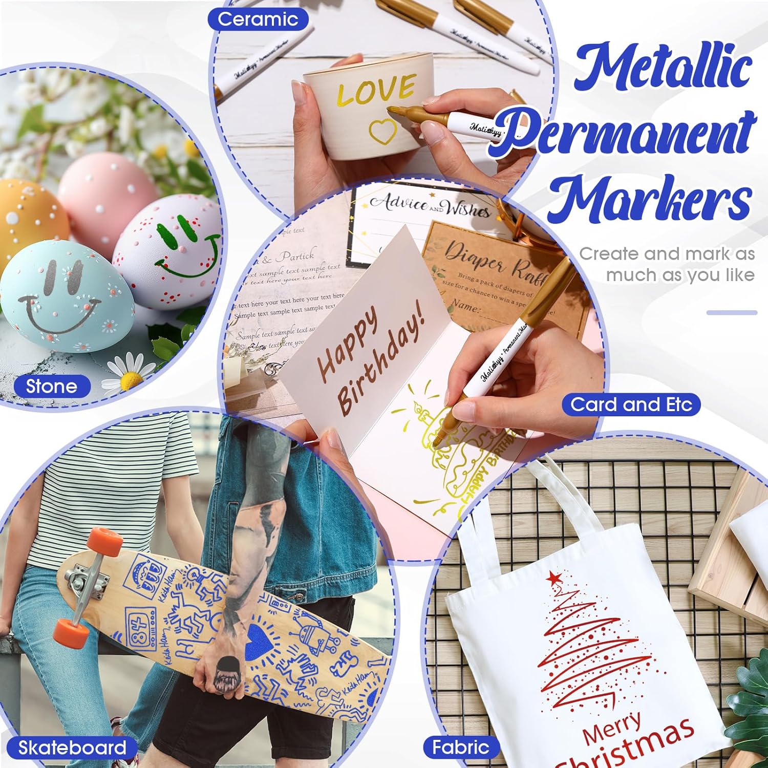- Widely Application: These metallic permanent markers can add a metallic touch to your projects, perfect for making thank you cards, birthday cards, craft decorations, DIY photo albums or scrapbooks, signing, drawing, making personalized coffee mugs, DIY gift bags, labeling storage and shipping boxes, etc