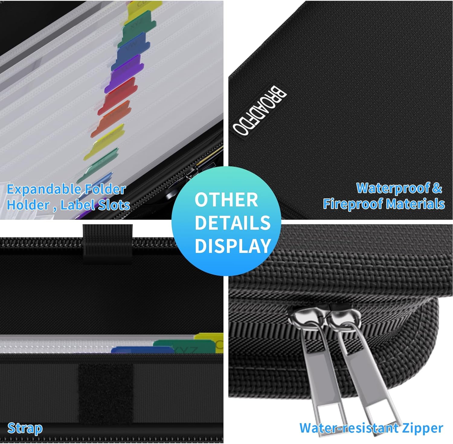 - Ultimate Fireproof & Waterproof Protection for Your Valuables Keep your documents safe with Broadfdo’s fireproof accordion file organizer, capable of withstanding heat up to 5200°F. Its waterproof and dust-resistant coating protects against spills, floods, and wet conditions, making it ideal for emergencies, home, office, and travel.