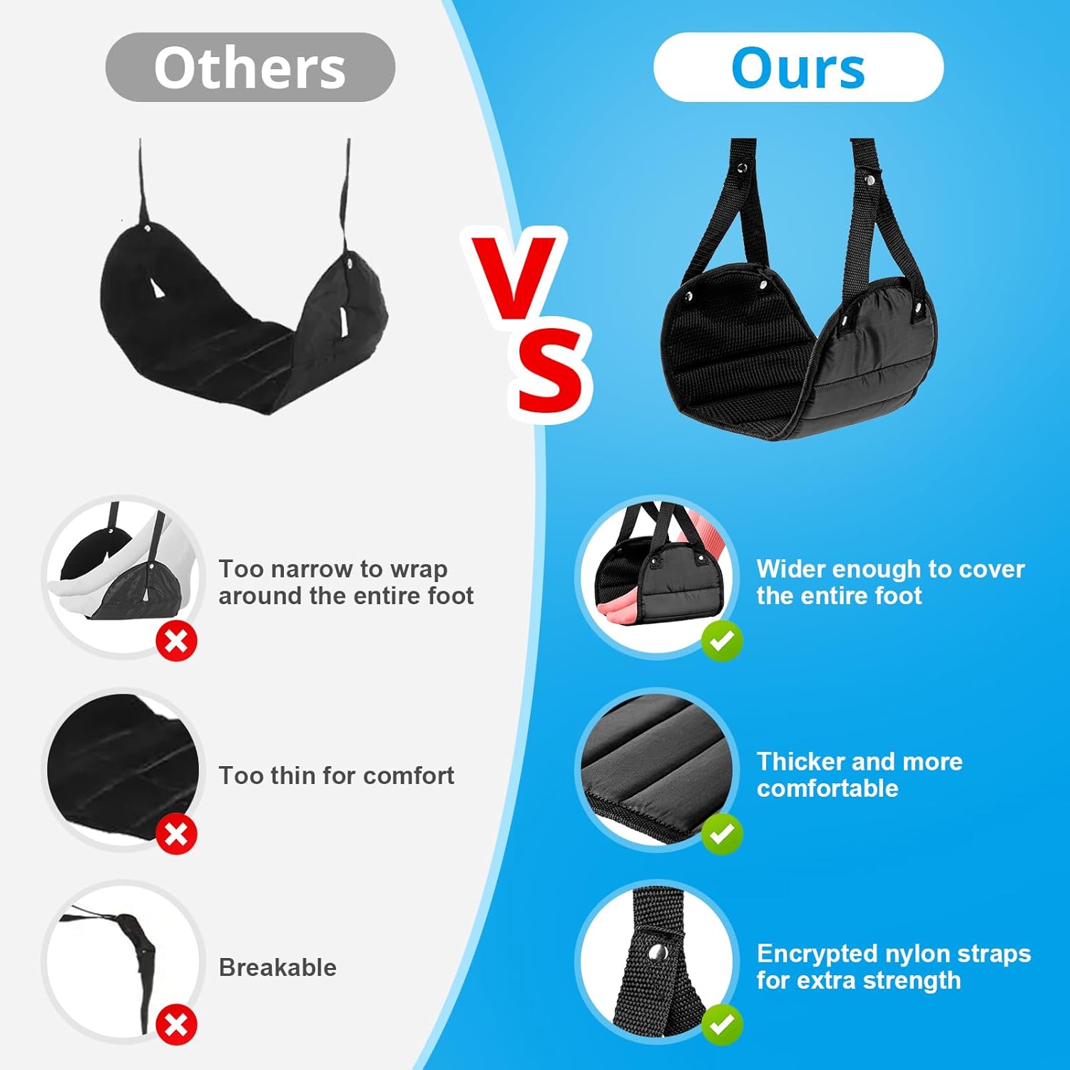 - High-quality Material and Foldable: Our airplane foot rest is made of high-quality fabric that is comfortable and breathable. Its thickened design makes it even more comfortable than regular airplane foot hammock.In addition, our sturdy high-density nylon straps and reinforced footrests with rivets provide superior durability and weight capacity.