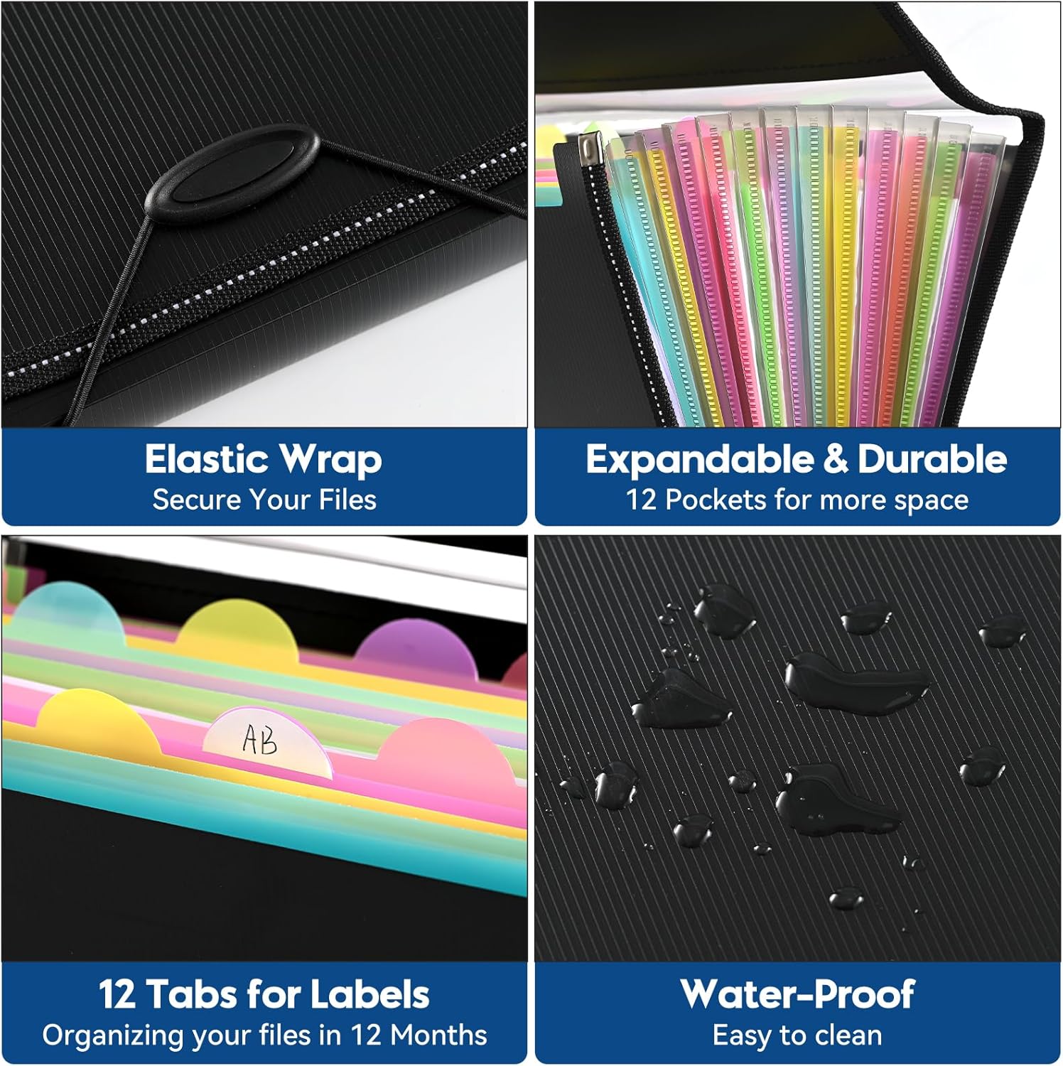 12-Pocket-Expanding File-Folder,Accordion-File-Organizer, A4/US Letter Size Paper Receipt Organizer Accordian Filing Folders (Black-C-12 Pockets)