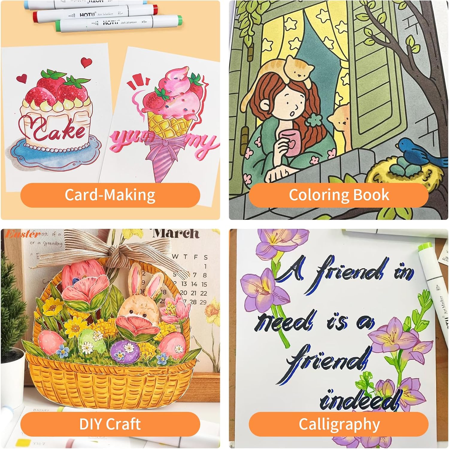 - 49 VIBRANT COLOR+1 COLORLESS BLENDER: HOTU Alcohol-based art marker set anging from soft pastels to vibrant deep tones, to meet the needs of various artistic creations and bring your ideas to life . Marker is very bright and diverse, offering a strong visual impact. They also boast good color stability and are water-resistant and sun-proof. From coloring books to professional art, our brush markers will breathe life into your artwork