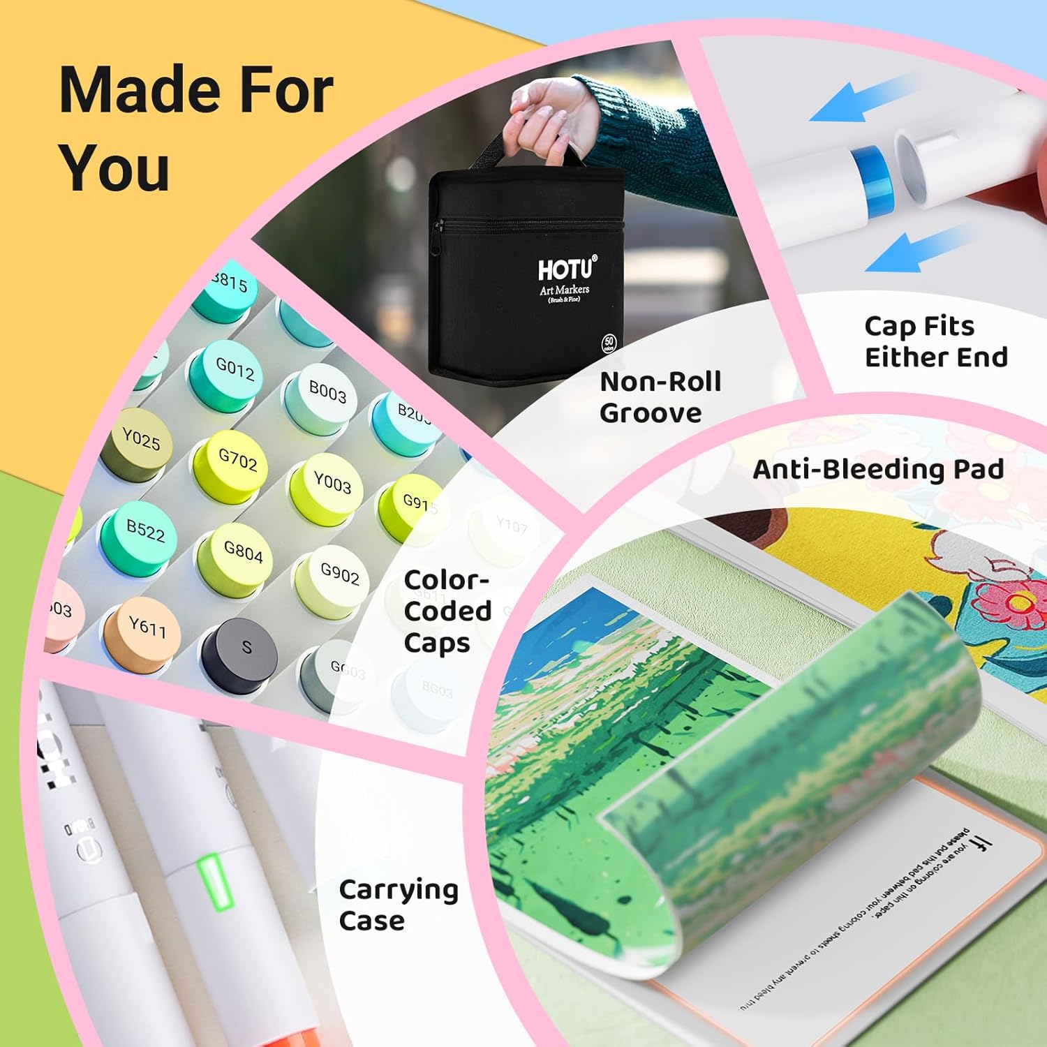 - ANTI-BLEEDING PAD : Our HOTU alcohol markers come with a matching anti-bleeding pad. You no longer need to worry about dirtying the table or other paper when creating, thus keeping the creative environment clean and perfect at all times. (NOTE: As alcohol based markers like all other brand alcohol markers, they will Bleed through regular coloring paper, except very thick paper, marker paper)