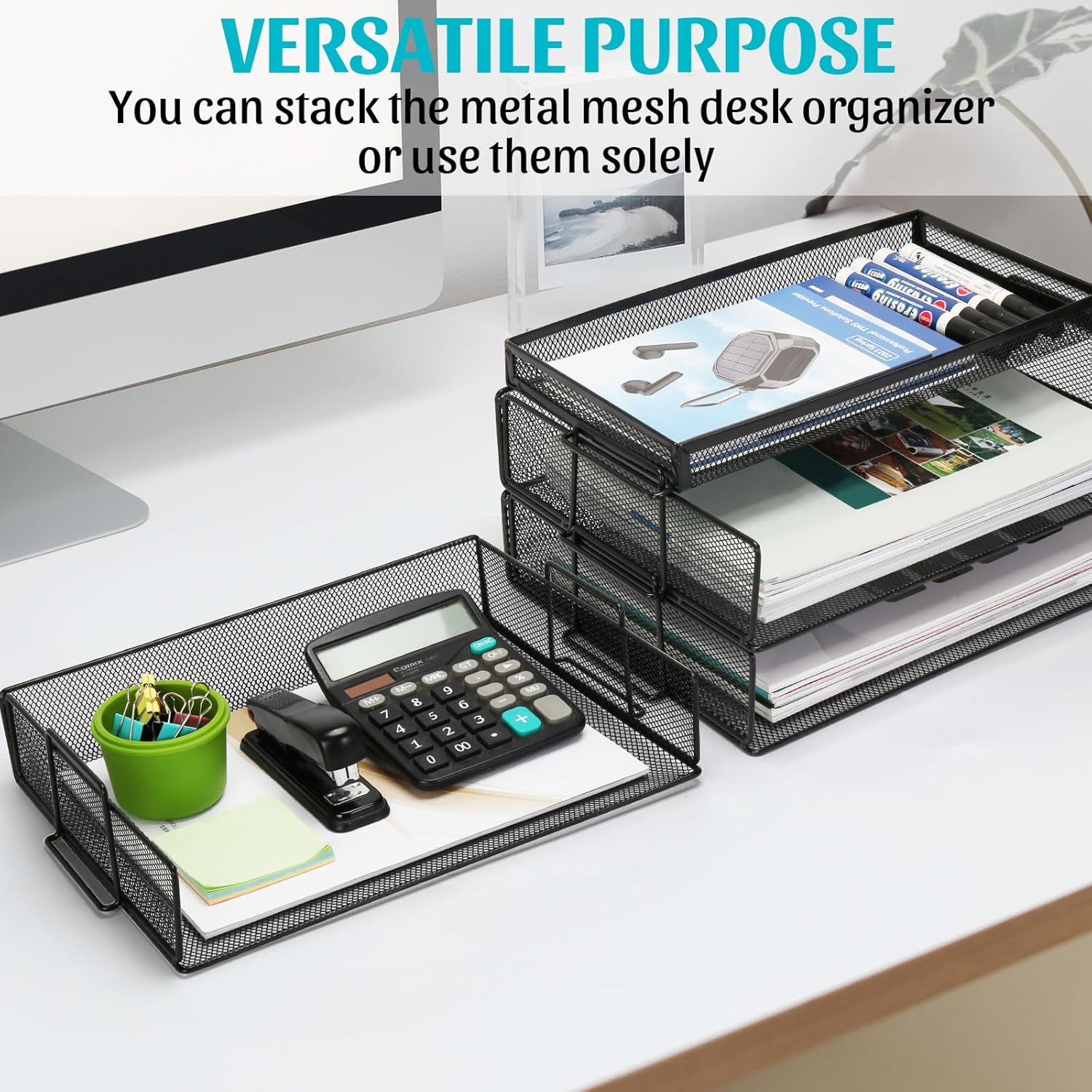 Office Drawer Organizer, 2 Tiers Stackable Paper Tray Organizer for Desk, Standing Papers File, Black Mesh/Office File Collation