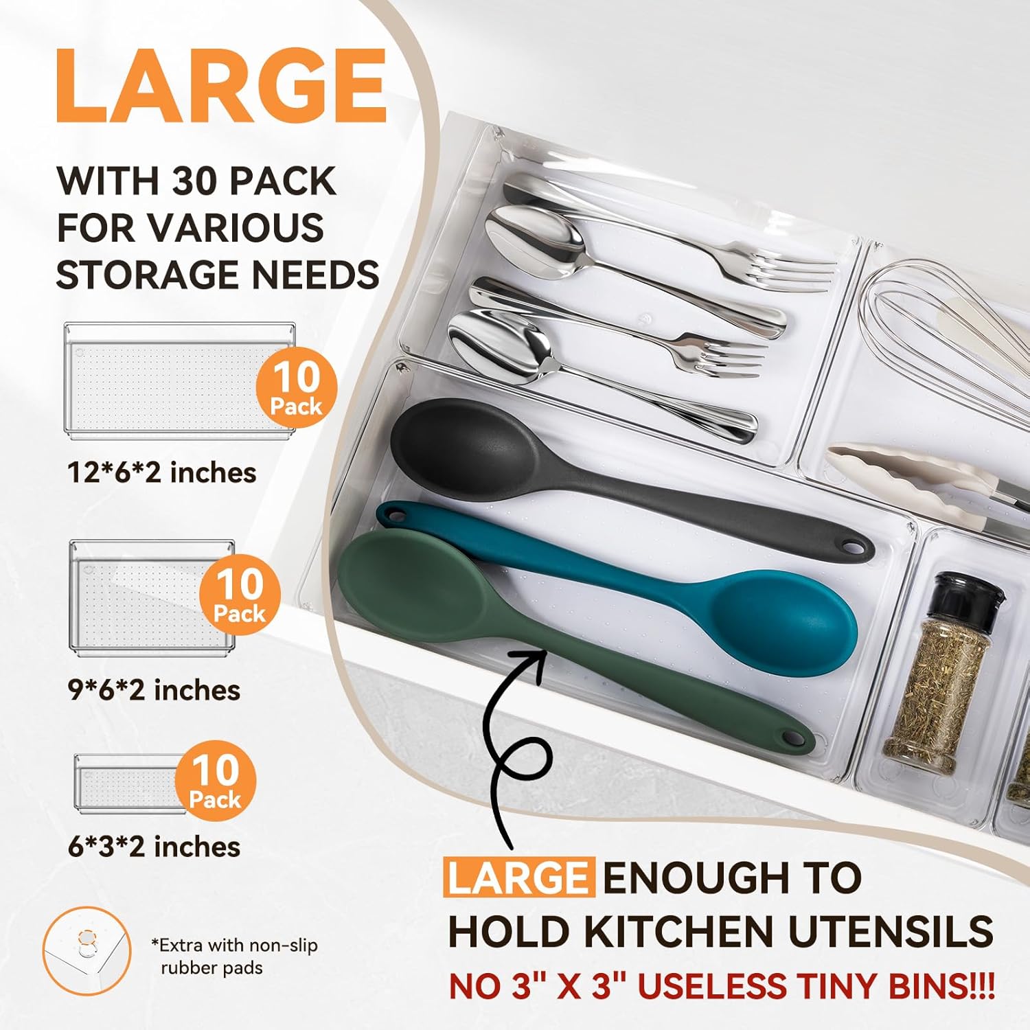 - 【LARGER SIZES】With 3 different sizes, our 30 pack clear drawer organizers could hold more gadgets, large and long enough to hold kitchen utensils, silverware, household tools and more. Includes: XL-12x6x2 inches(10pcs), L-9x6x2 inches(10pcs), M-6x3x2 inches(10pcs), Non-slip silicone pads(120pcs).
