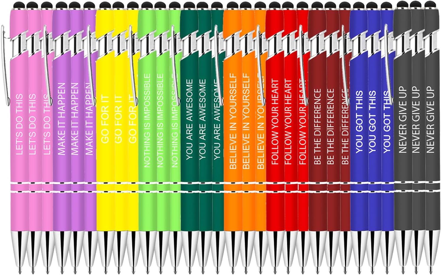 - Inspirational Quotes: Each cool pen is adorned with a different inspirational saying, like "GO FOR IT," "NEVER GIVE UP," "YOU GOT THIS," and "NOTHING IS IMPOSSIBLE." These high-quality pens with stylus tips in various colors will continue to motivate you for years to come.