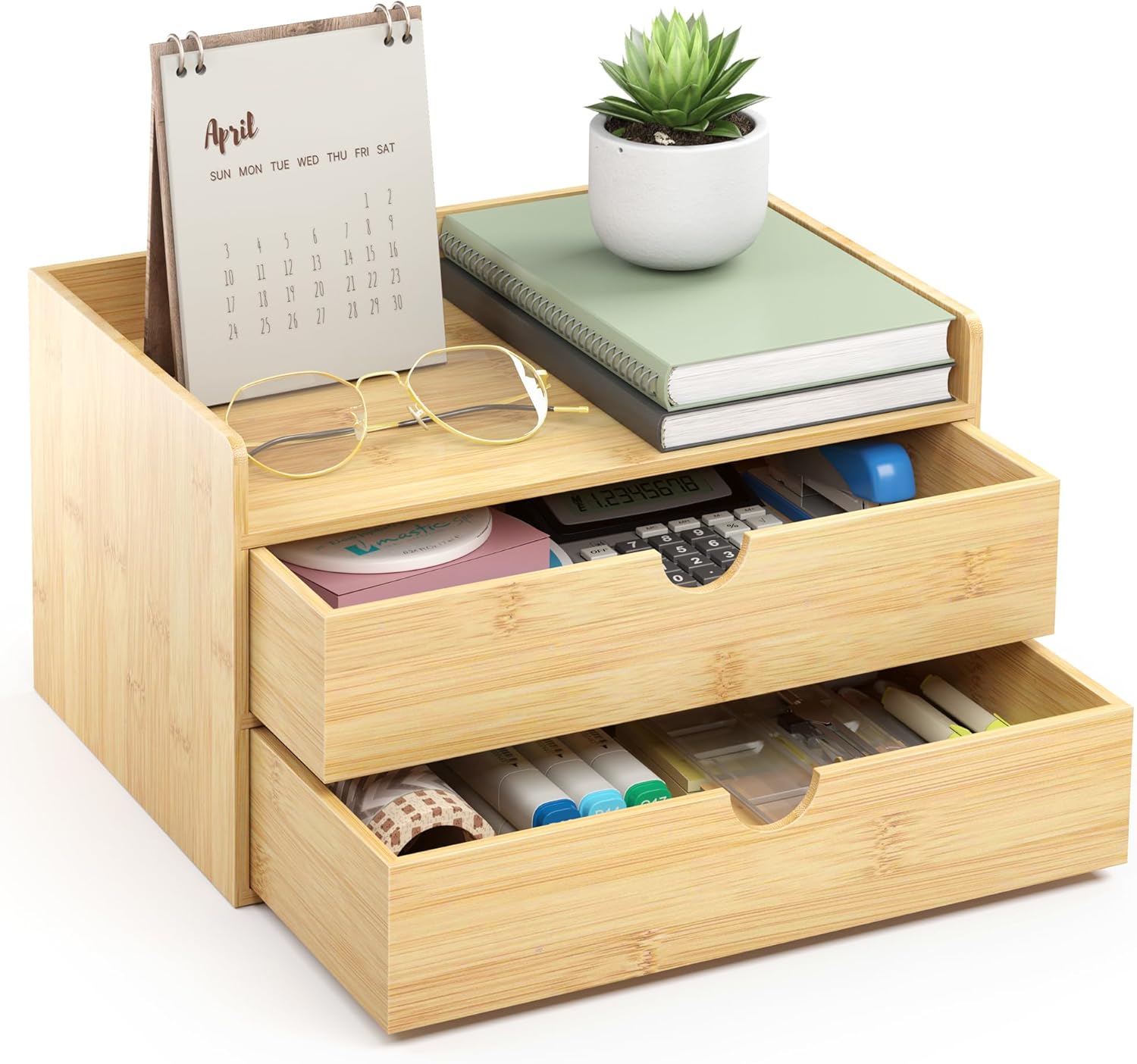 Wisuce Bamboo Desk Organizer - Mini Bamboo Desk Drawer Tabletop Cosmetic Storage Organization for Office or Home (Nature 2 Drawers)
