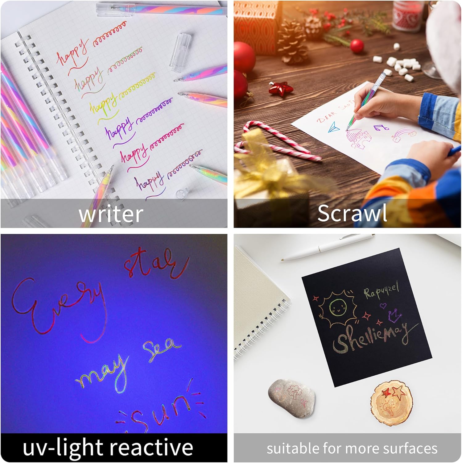 - 【Magical 3-Color Mixing with Stable Chroma】18 unique pens combine Glitter (6), Neon (6), and Pastel (6) formulas to create seamless gradients. Each pen contains triple-color ink blends for dynamic transitions with every stroke. New! Enhanced color stability prevents uneven fading or streaking, ensuring vivid rainbow effects on both light & dark papers