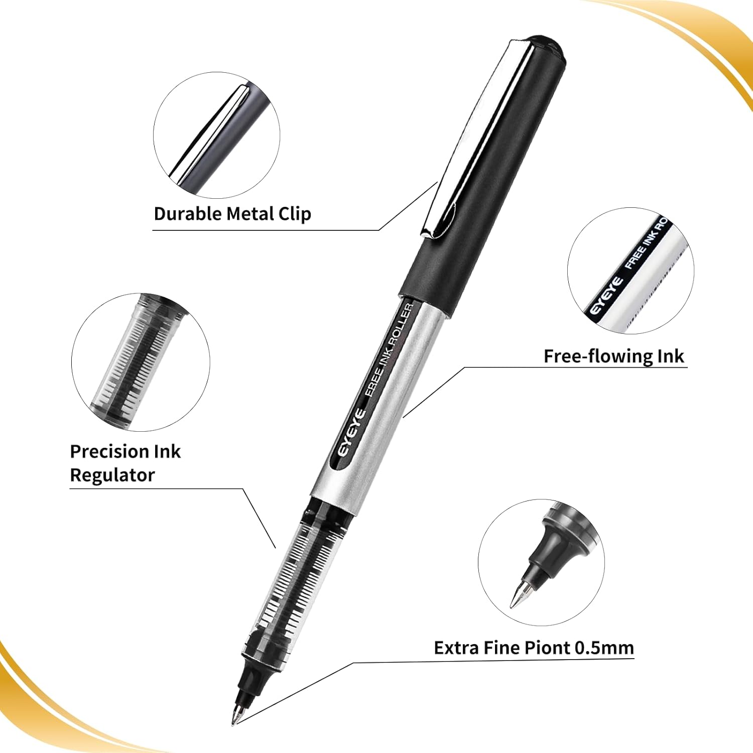 EYEYE Rollerball Pens Black 0.5mm, 8 Pack Extra Fine Point Quick Dry, Liquid Ink Pens Fine Point Smooth Writing Pen for Journaling, Note Taking, Office, School Supplies
