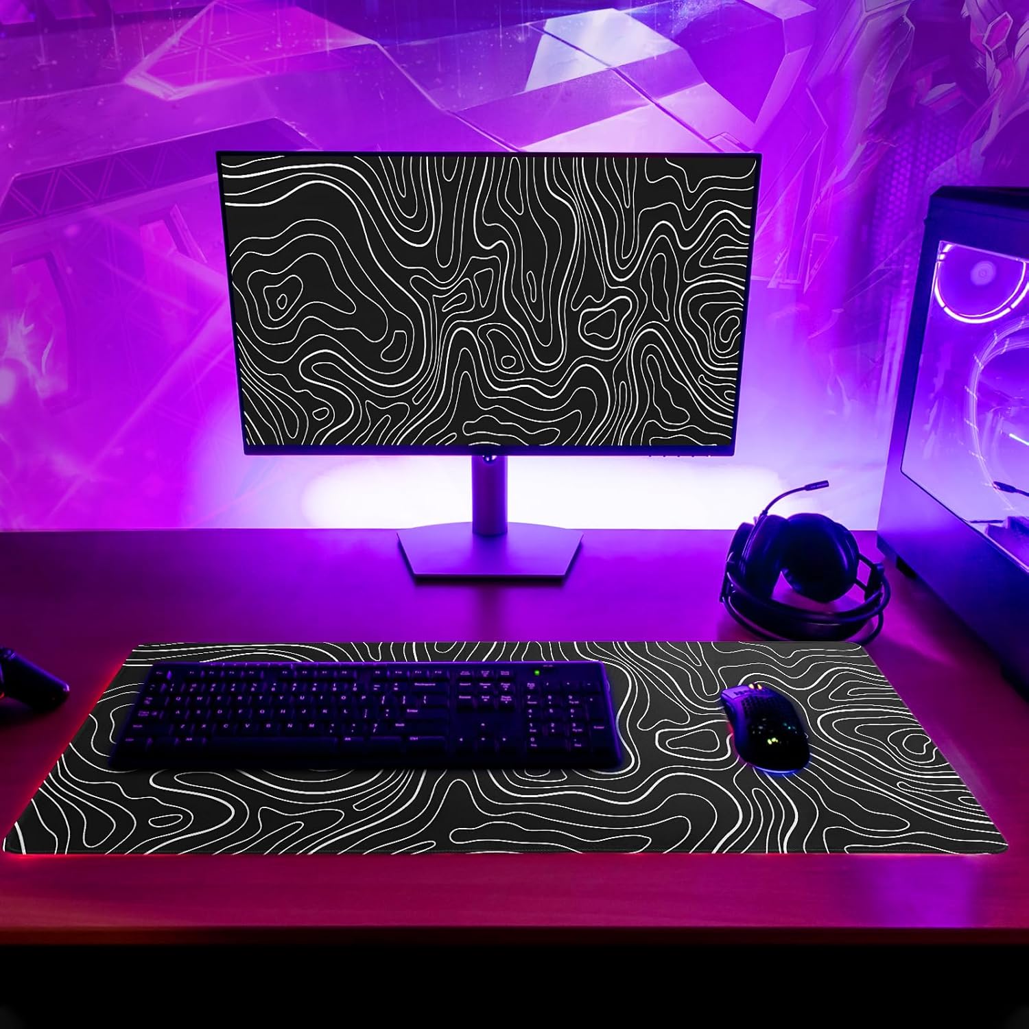 Gaming Mouse Pad Topographic Large Mousepad Keyboard 31.5 x 11.8in for Non-Slip Base and Stitched Edge, Extended Desk Pad XL Desk Mat (Black)