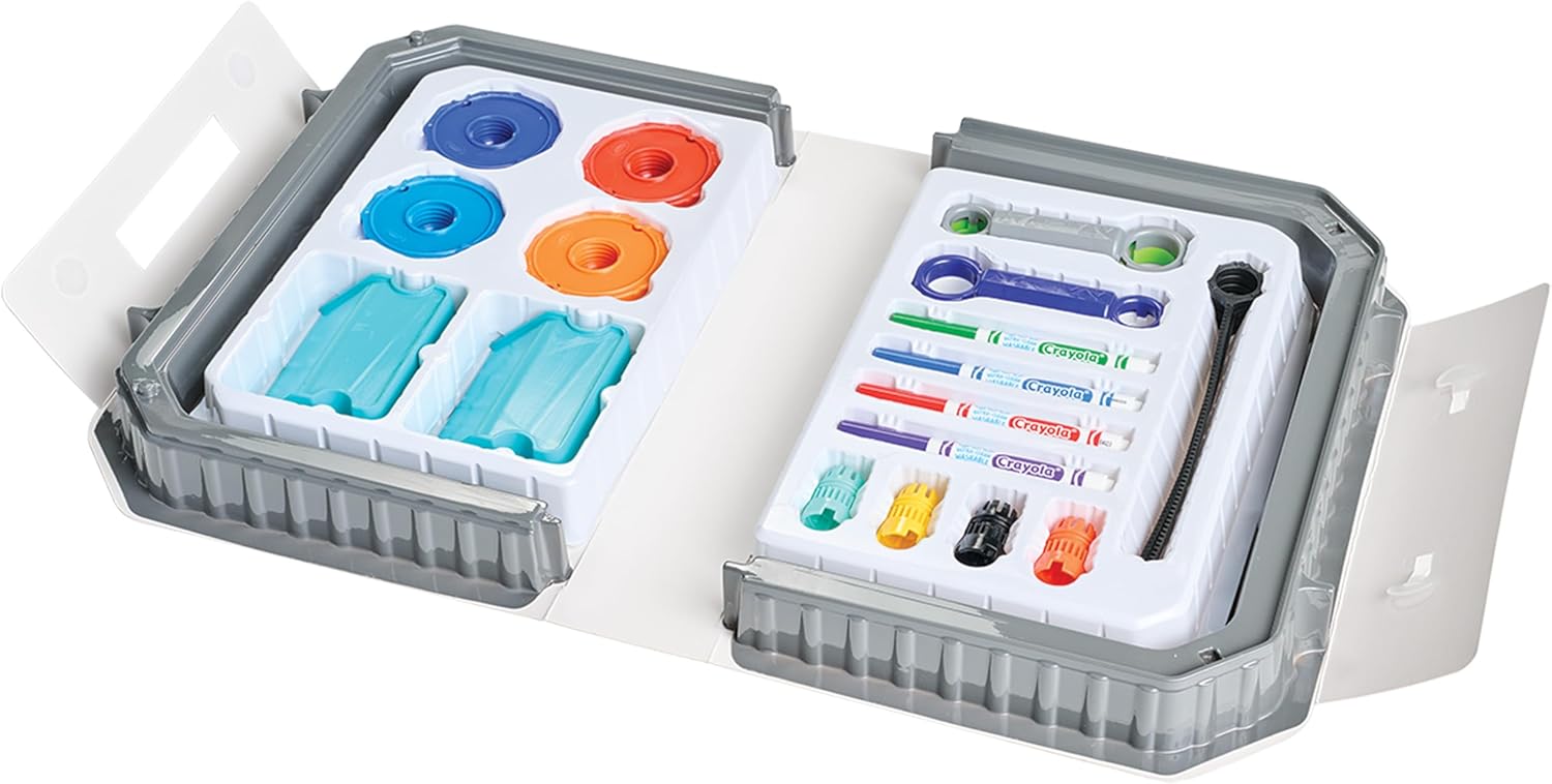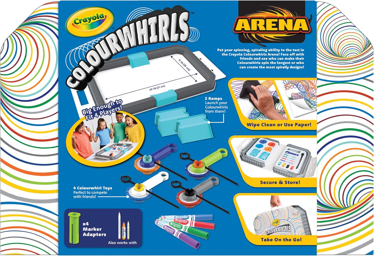 - CRAYOLA COLOURWHIRLS ARENA SET: Includes 1 Arena for 4 players, 4 Colourwhirl toys, 4 Markers, 2 Ramps, and a Carrying Case for colorful fun anywhere.