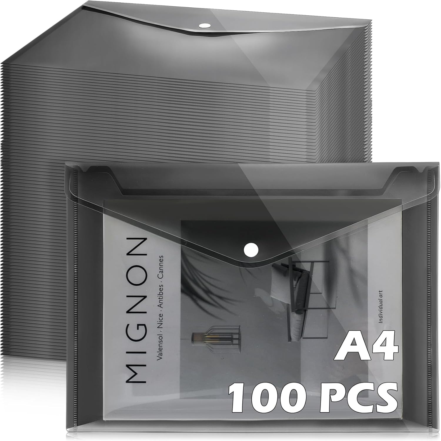 100 Pcs Clear Envelopes with Snap Button Closure Bulk A4 Letter Size Clear Plastic Envelope Folder Document Organizer File Folders for Office Home(Black)