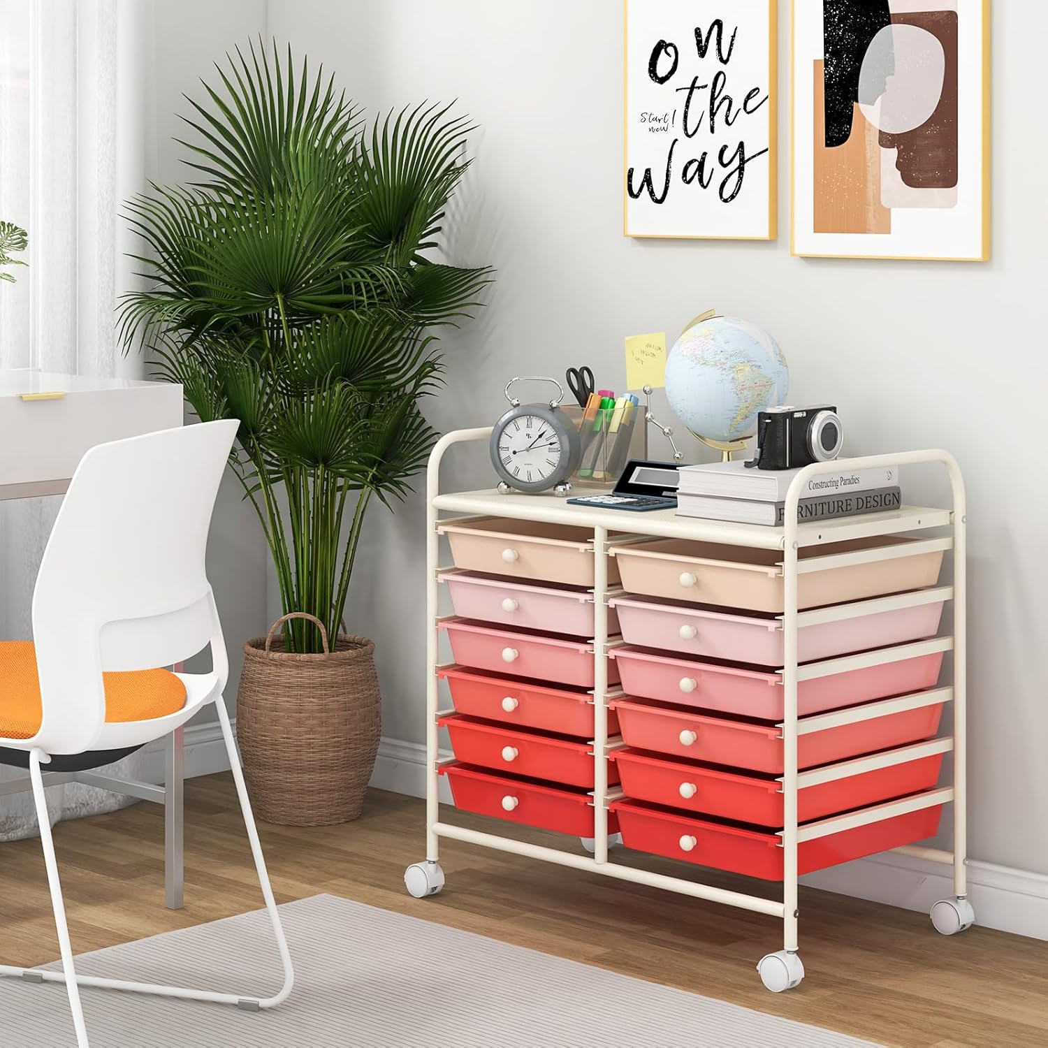 Giantex 12 Drawers Rolling Cart, Mobile Storage Drawer Cart, Classroom Organizer Cart for Office School Supplies Tools Scrapbook Paper Craft Small Printer, Utility Cart on Wheels, Pink Gradient
