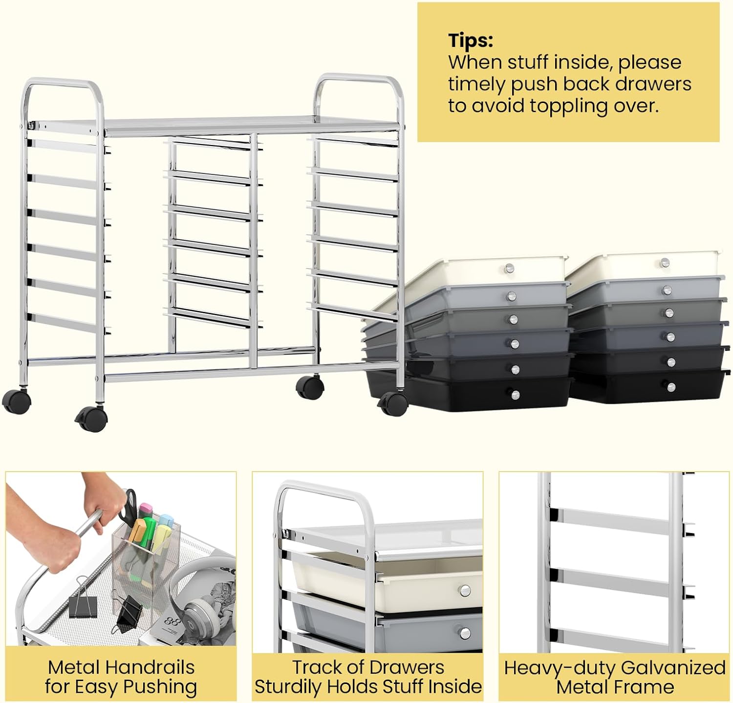 - [Easy Assembly & Maintenance]: The drawer cart on wheels comes with detailed instructions and complete accessories for easy assembly. The smooth surface is easy to clean by wiping with a damp cloth.