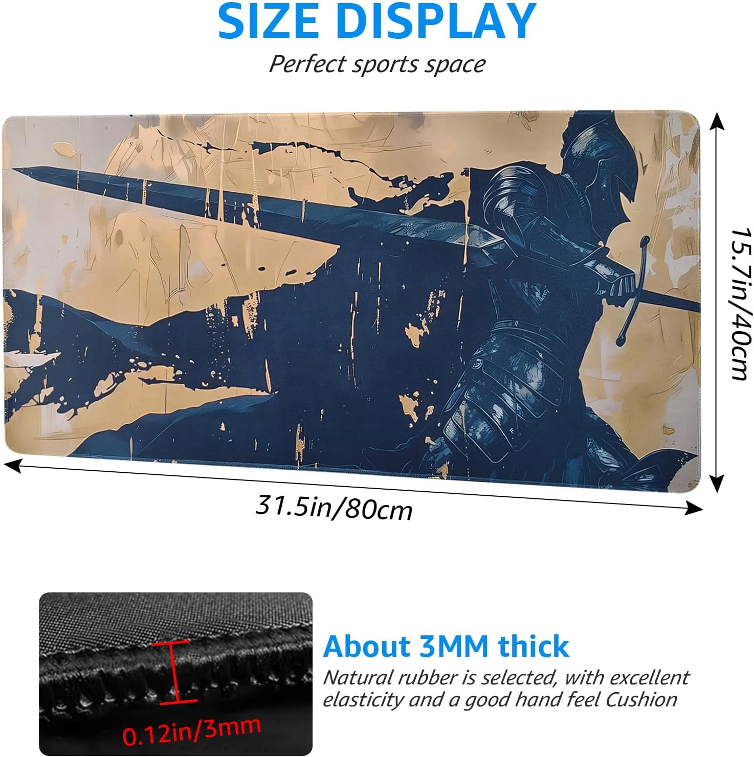 Non-Slip and Waterproof Gaming Mouse Pad, Extended XXL Desk Mat, Medieval Knight Design, Navy Blue and Beige, 31.5 x 15.7 inches, Lightweight