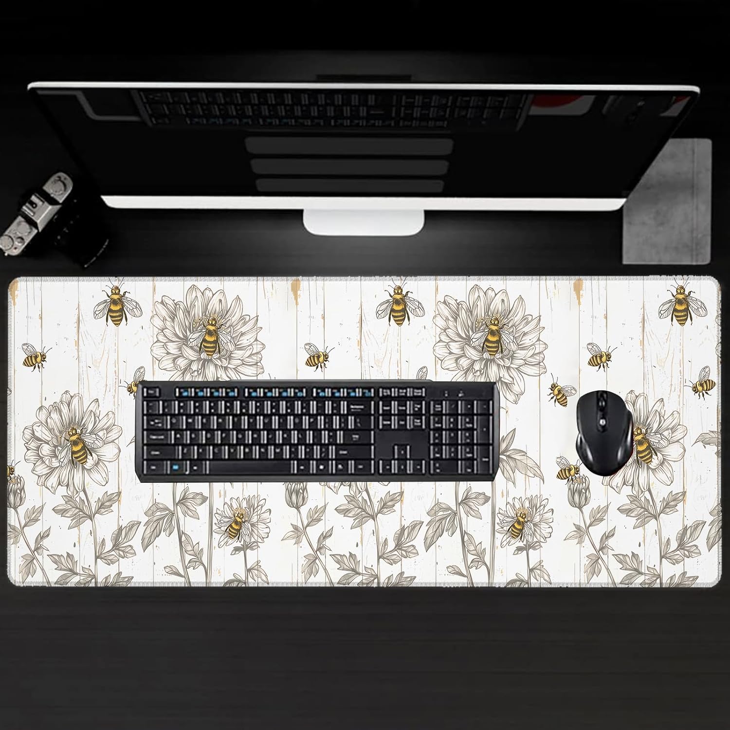 Bee Large Gaming Desk Mat,Rubber Non-Slip Bumble Floral Mouse Pad,31.5x11.8x0.12in Extended Multiple Colors Cute Sketch Bees Mousepad,Game Lover Mice Pads Gifts,Office Home Deskmat Decor