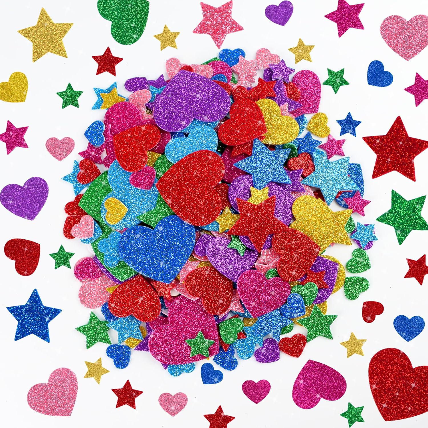 - High-Quality Material: These foam stickers are crafted from soft, high-quality glitter foam. They feature charming star and heart shapes, boasting a colorful and sparkling appearance. Durable and sparkly, they are easy to apply to multiple surfaces. They offer long-lasting adhesion and a smooth finish, ensuring that your decorations stay vibrant and intact for an extended period