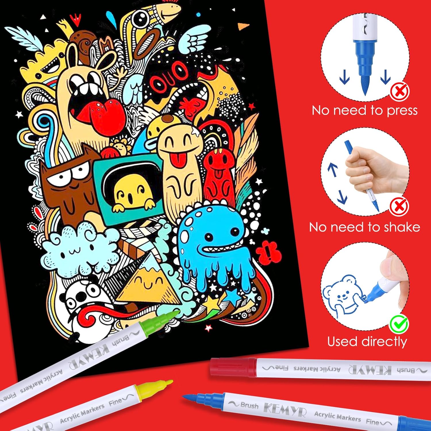 - Dual Tip Acrylic Paint Pens----Each KEMYR pen is equipped with a 1 mm fine tip for lines and details work, and a 1 - 5 mm brush tip for filling large areas and coloring. By changing the brush pressure, you can create different strokes, saving the trouble of changing tips.