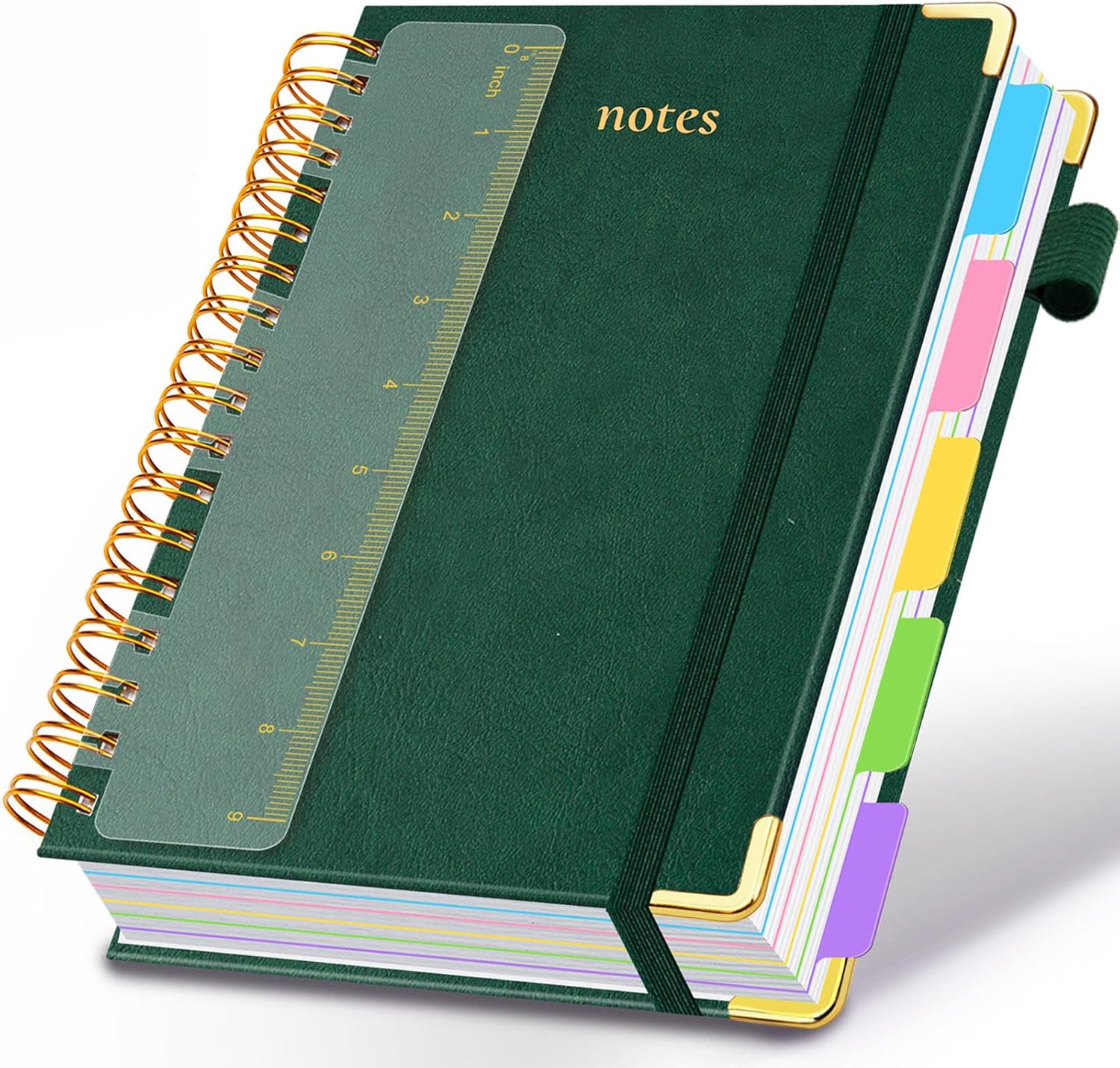Hardcover Spiral Notebook 8"x10" Journal Notebook with Tabs and Removable Dividers 300 Pages 5 Subject Notebook College Ruled, Faux Leather Spiral Bound Notebook for Women, Students, School Work (Green)