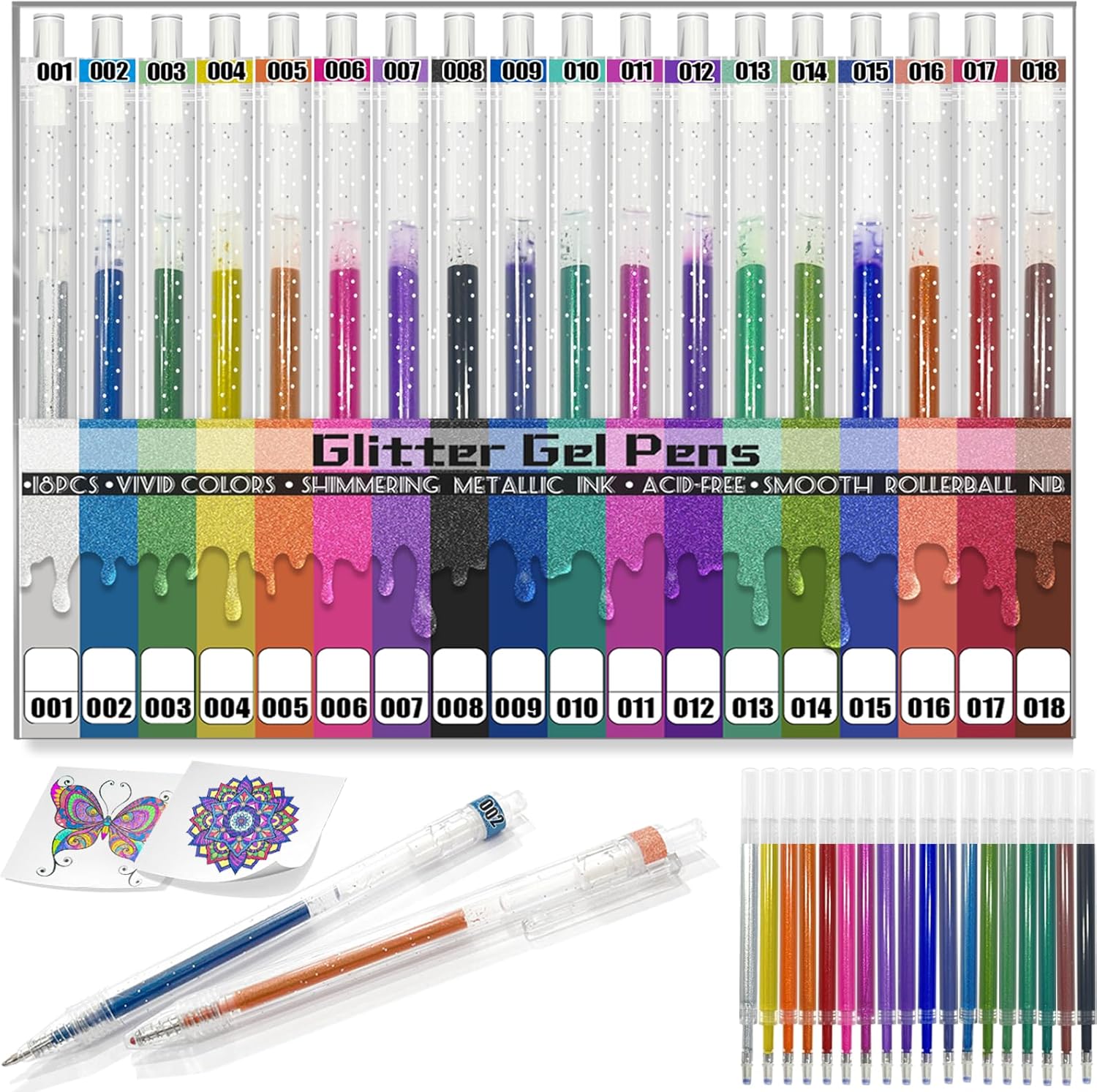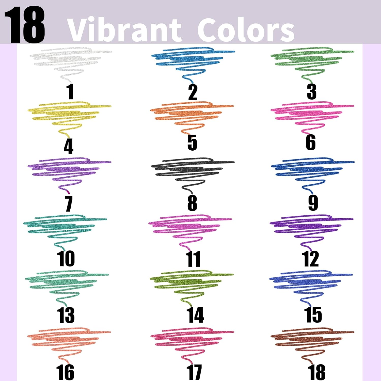 - METALLIC GLITTER PENS: Our glitter pens will open a whole new chapter in your artistic journey and inspire your creativity in drawing and design. This glitter pens for adults contains 18 brightly colored pens and 18 replacement colored refills that sparkle and shine to instantly ignite your inner imagination and bring your coloring life to life