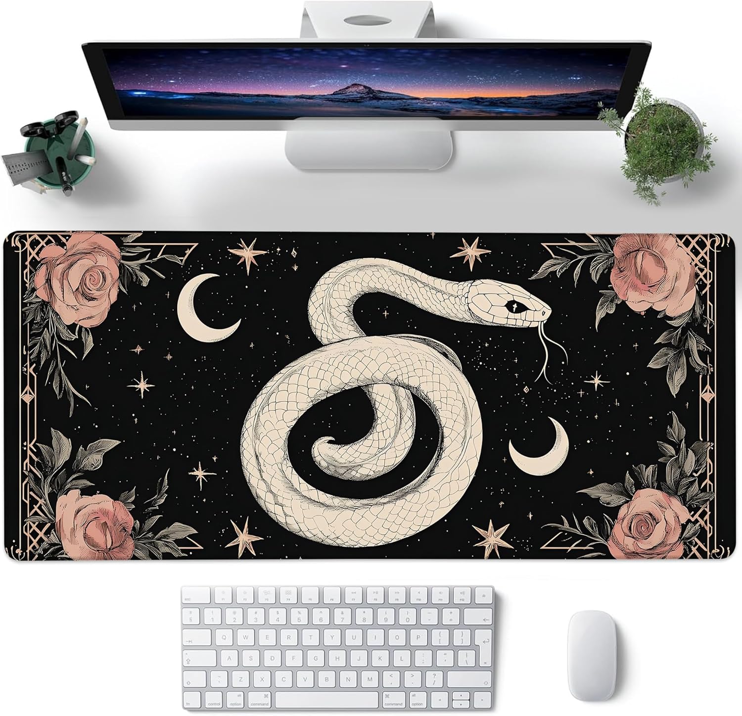 Desk Mat, Boho Gothic Snake and Pink Rose Large Gaming Mouse Pad with Non-Slip Base Stitched Edges,Desk pad for Keyboard and Mouse Home Office 35.4"x15.7"