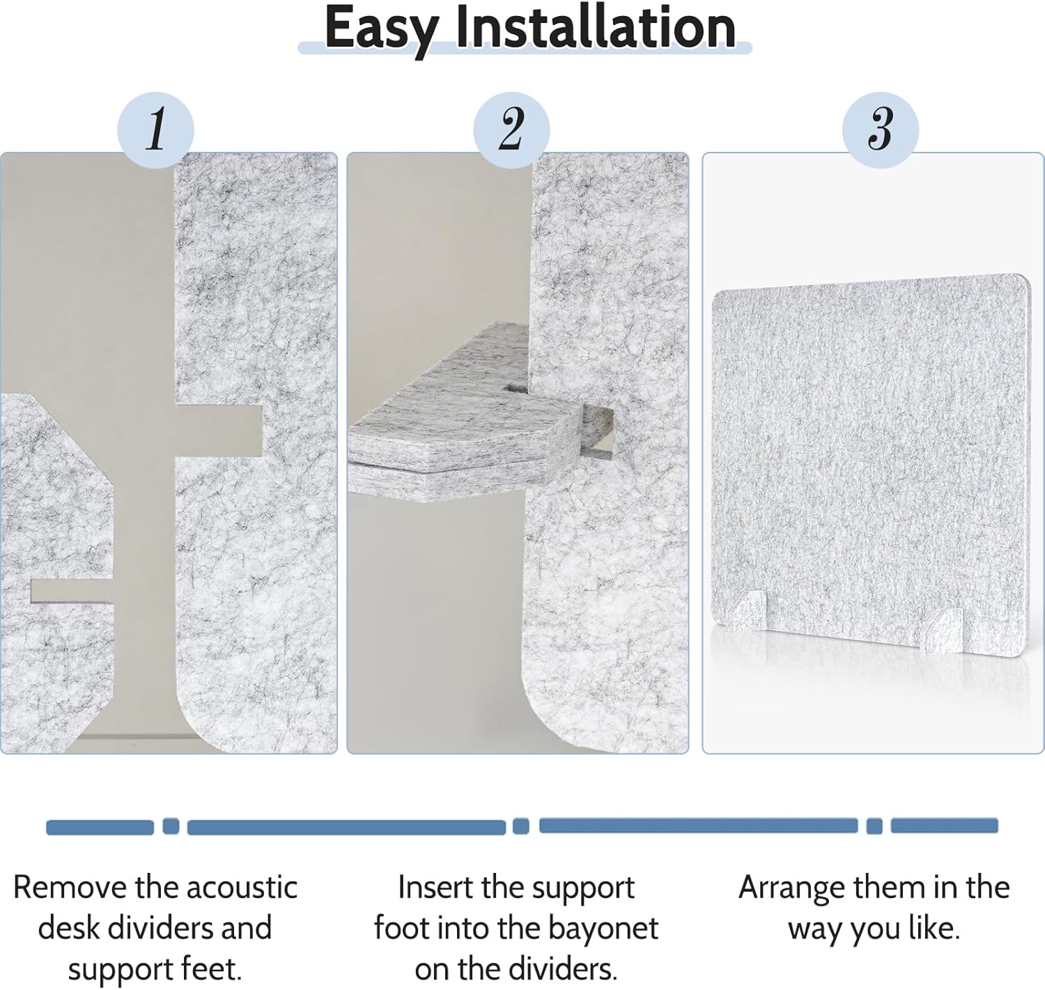 - 【Easy Installation】- Set up your acoustic desk dividers easily. First, take out the dividers and support feet. Then, insert the feet into the slot on the dividers. Finally, arrange the soundproof room dividers as you like to fit your workspace. You can set them up in minutes, saving you time and energy