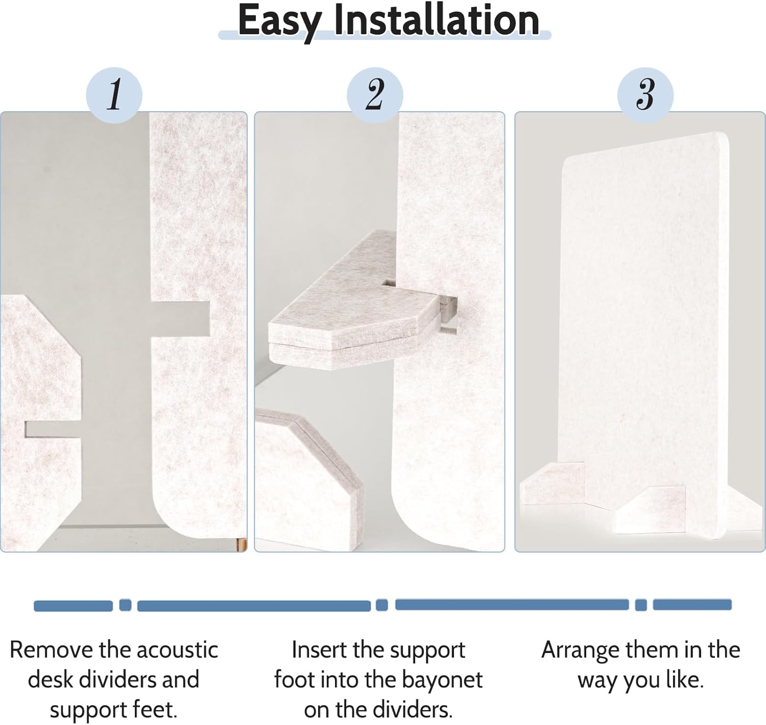 - 【Easy Installation】- Set up your acoustic desk dividers easily. First, take out the dividers and support feet. Then, insert the feet into the slot on the dividers. Finally, arrange the soundproof room dividers as you like to fit your workspace. You can set them up in minutes, saving you time and energy