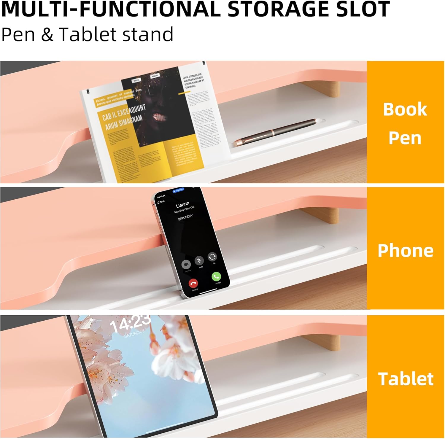 2 Tier Dual Monitor Stand Riser,Wider Board Computer Monitor Stand for 2 Monitors,Slot For Phone/Tablet Office Desktop Organizer for Laptop,PC,Computer,Printer,Pink