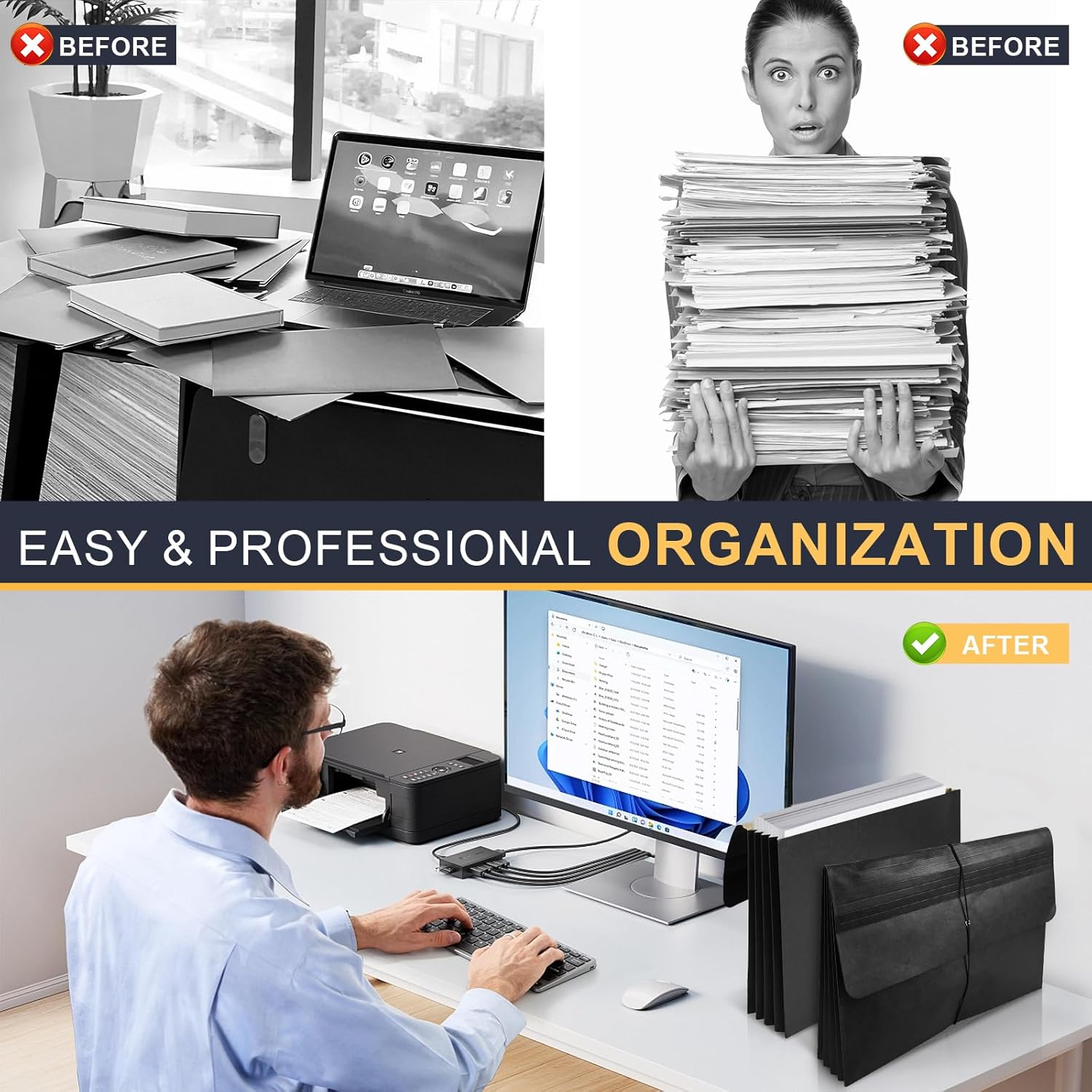 - Kraft Paper Material: Made of high-strength kraft paper, this accordion folder combines durability with simple beauty. The matte black appearance is more professional and suitable for business meetings, offices and study scenes. Lightweight but strong, it is a practical storage tool