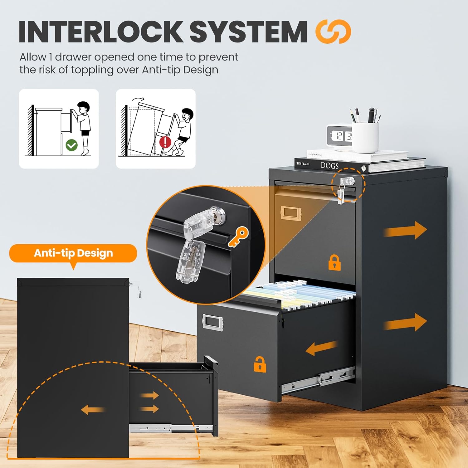 - 【Metal Locking File Cabinet】:AFAIF modern Vertical file cabinet has one lock which locks all drawers, when one drawer has been opened, the interlocking drawer system prevents the other drawer from opening, which prevents tipping. And is equipped with two keys, which can help you keep your valuables and documents safe. The Lockable file cabinet can be fixed beside the desk.
