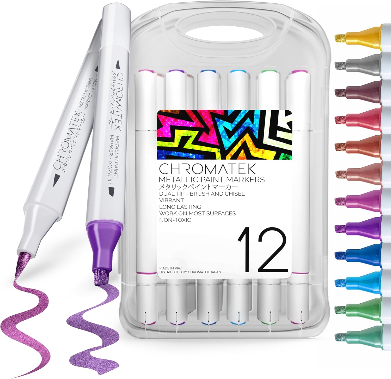- Vibrant Metallic Ink: Bring your art to life with 12 ultra-bright metallic paint markers. Each vivid color shines on both dark and light surfaces, ideal for bold accents, shimmering details, and eye-catching designs. Use them to personalize cards, decorate mugs, embellish crafts, or elevate DIY projects. With smooth coverage and brilliant pigmentation, Chromatek metallic ink ensures your artwork stands out with dazzling shine and professional-looking results on every surface.