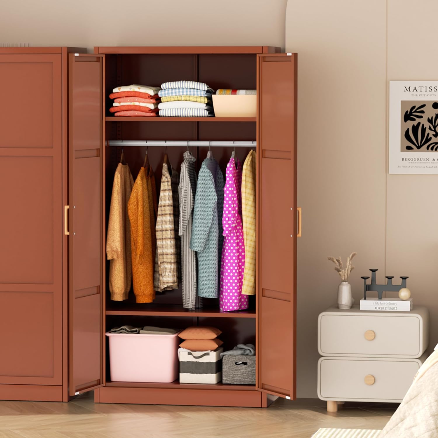 - Safe & Stable Wardrobe: Greenvelly Metal Armoire Cabinet Doors are equipped with 2 powerful magnetic closures to ensure that the doors close tightly and keep your belongings safe from dust. In addition, its well-designed anti-tipping system enables the steel wardrobe to be securely fixed to the wall, effectively preventing the possibility of accidental tipping.Metal storage cabinet can be used with confidence, especially for families with children.