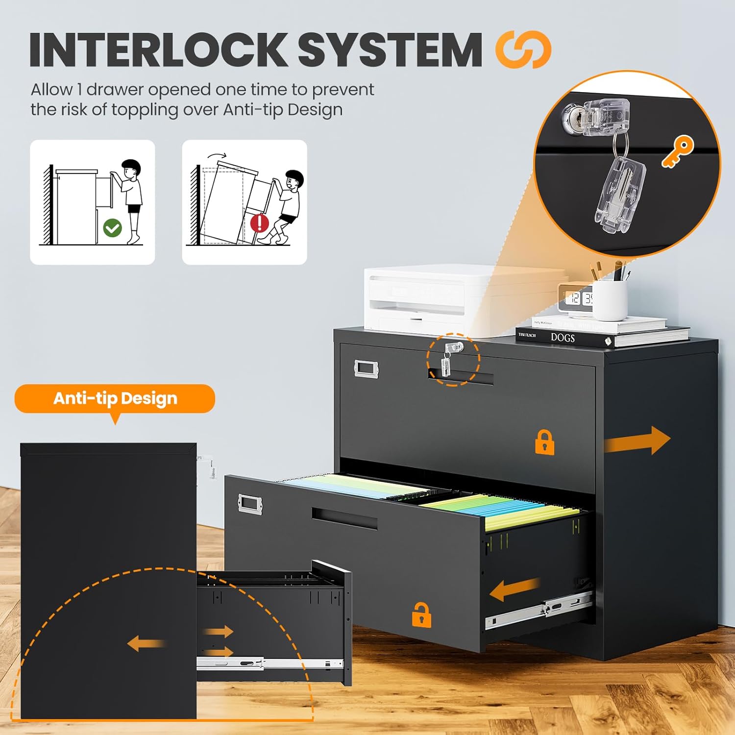 - 【Security Locking System】 ▶AFAIF locking lateral file cabinet has a security and safety lock system, one lock can lock all drawers. When one of the drawers has been opened, the interlocking drawer system prevents the other drawer from opening, which prevents tipping and it come with 2 keys for your backup using. This modern lateral filing cabinet with locks, can help you keep your valuables and documents safe, such as contracts, receipts, cards, certificates, meeting materials, passports etc.